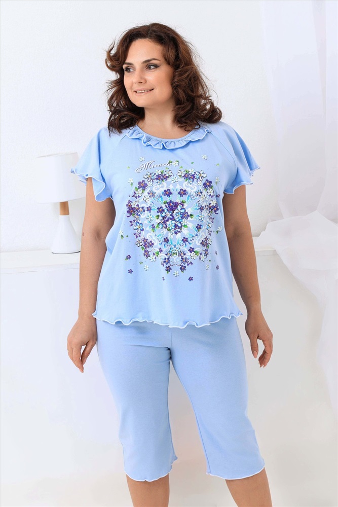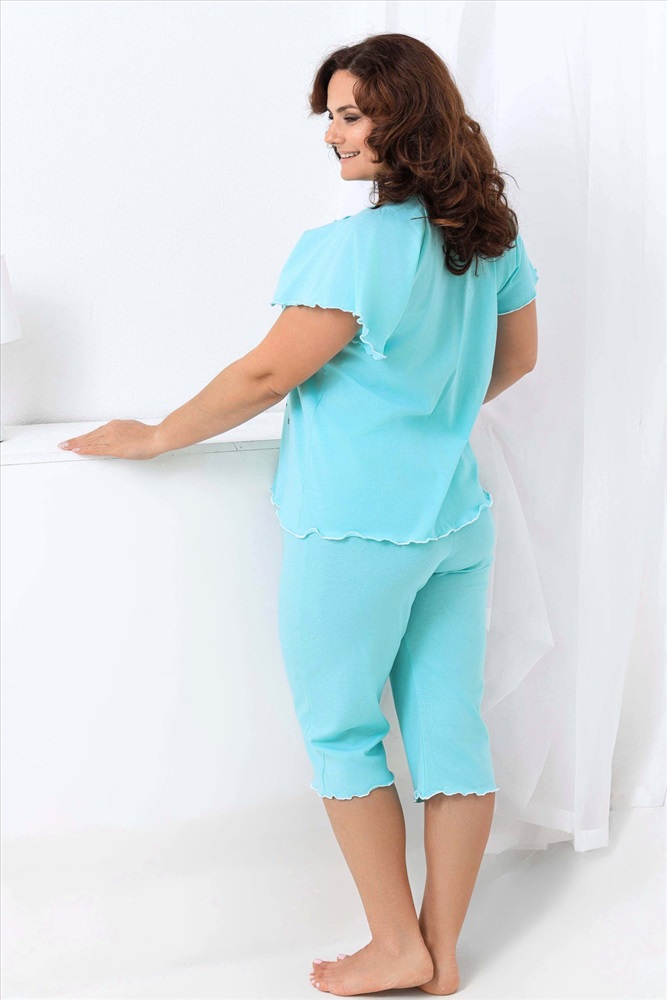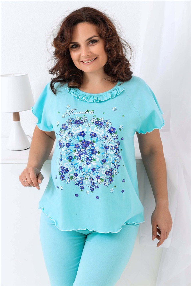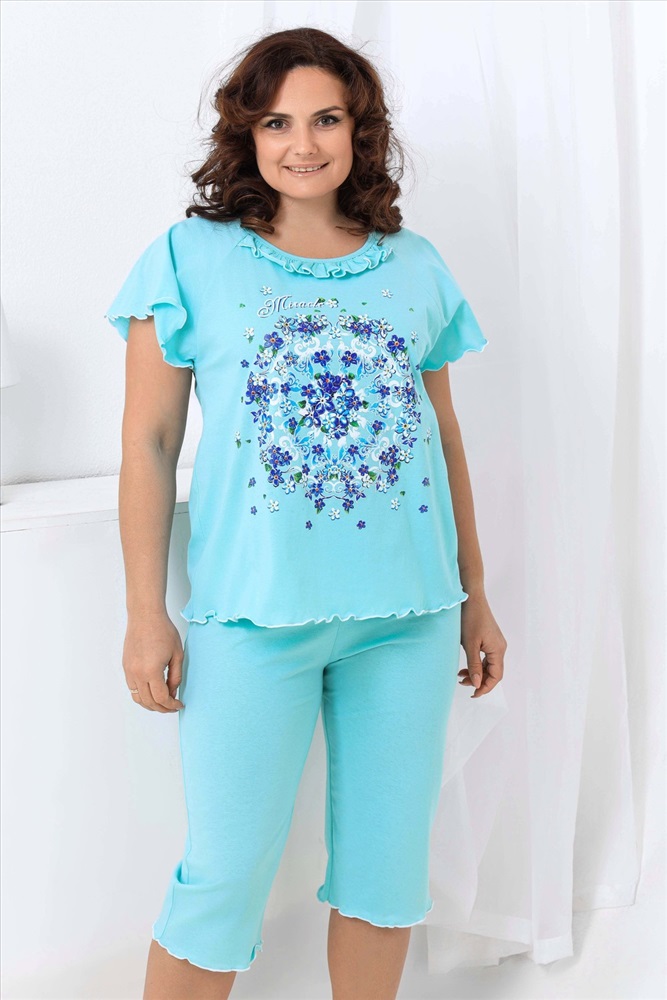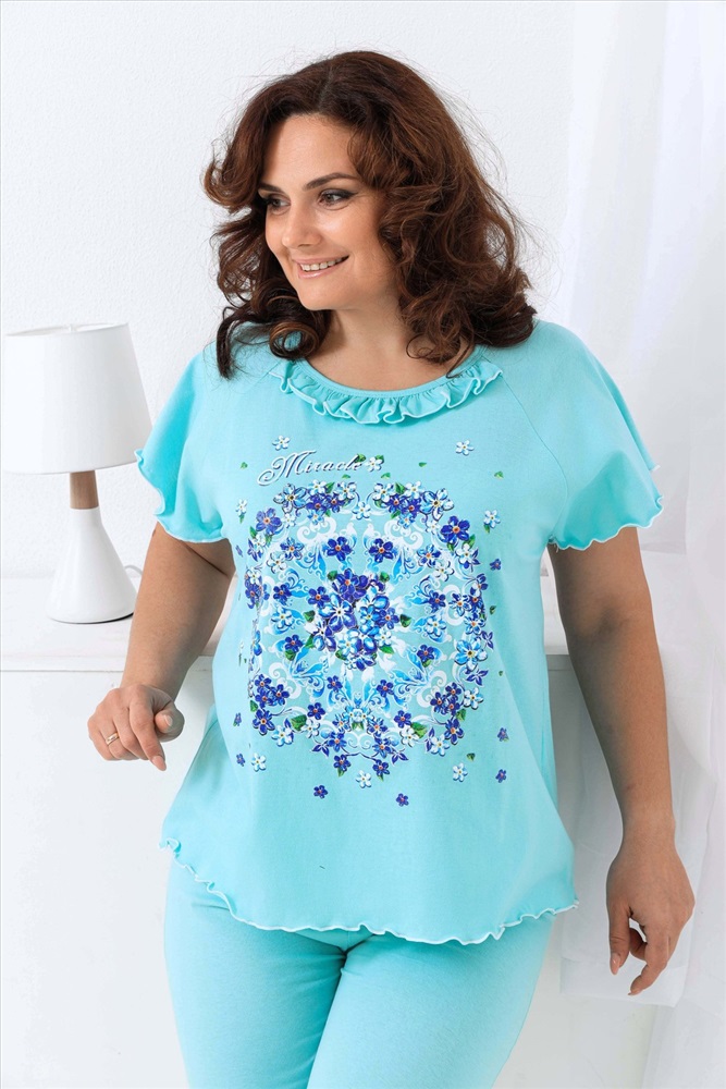 Застежка: без застежки Пижама женская с симпатичной рюшей по горловине. Очень свободный и удобный крой. Рукав-реглан не стесняет движение рук. Обработка рукава и низа изделия в виде лёгкой волны придаёт лёгкость и воздушность. Шикарный принт в виде орнамента из россыпи цветов. Оттенок ментола может отличаться от фото.