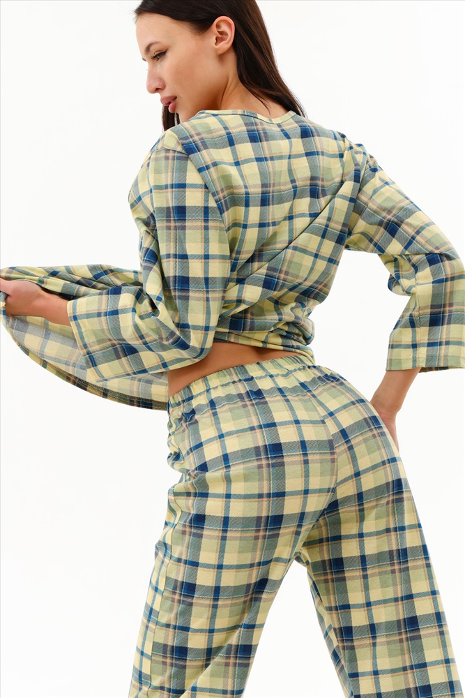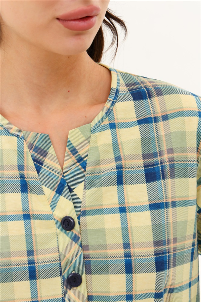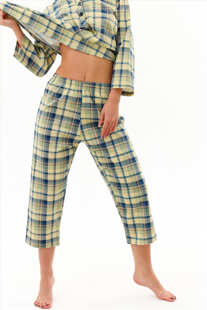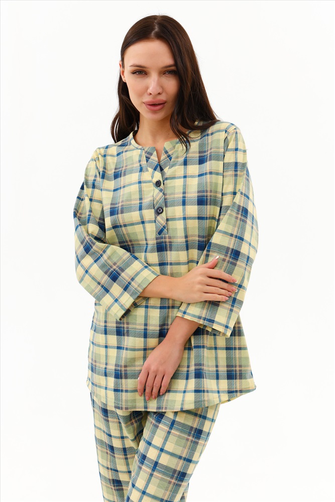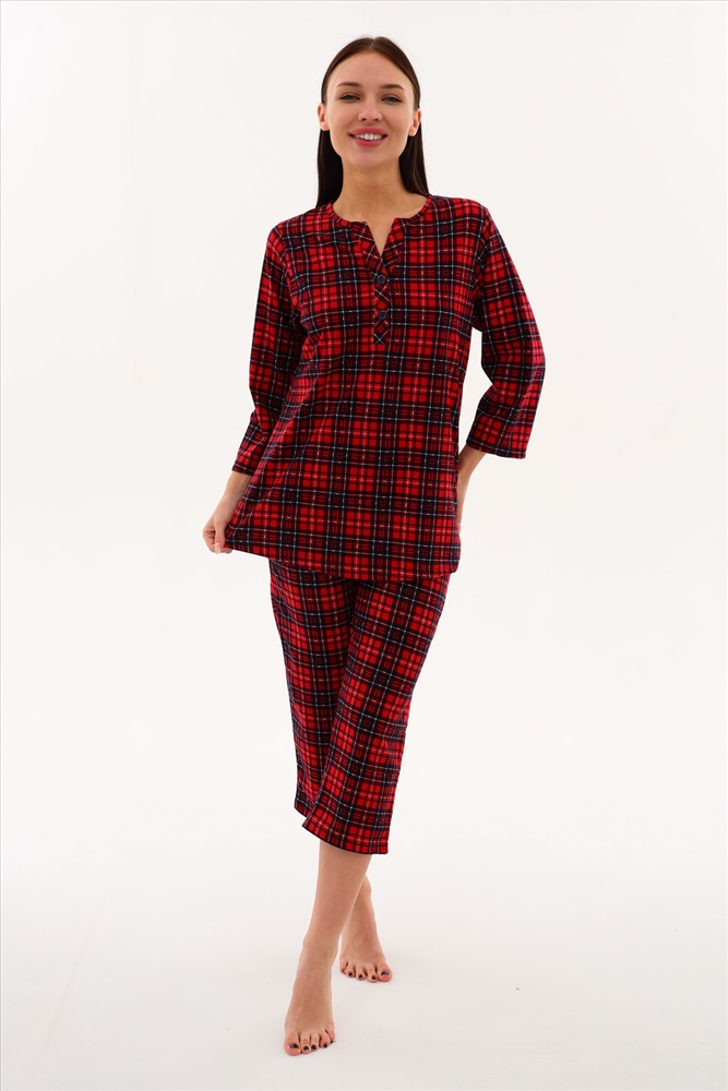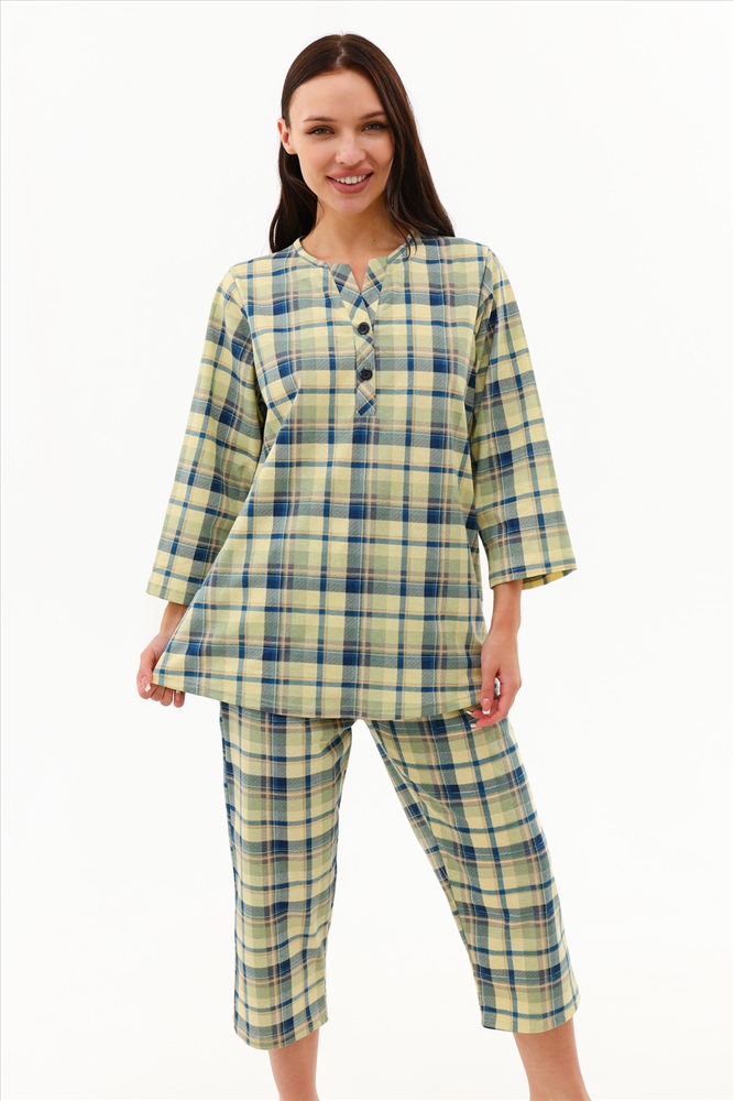 Застежка: пуговицы Пижама выполнена из комфортной приятной к телу ткани. Состоит из удлинённой кофты с застёжкой - поло и бридж. Низ кофты слегка закруглён к боковым срезам. Пижамка хорошо садиться на любой тип фигуры за счёт большого размера припусков на свободу облегания. Бриджи с высокой удобной посадкой на эластичной резинке 3 см. Качественно. Уютно. Для тебя. Носите с удовольствием.