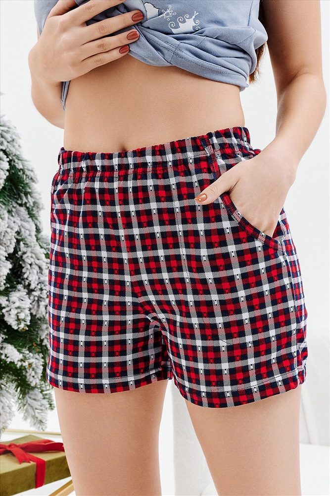 Страна производства: Россия Пижама женская с новогодним принтом - майка с шортами. На шортах боковые карманы. Горловина и пройма обработаны кантом с нитками разной колористики под цвет принта.