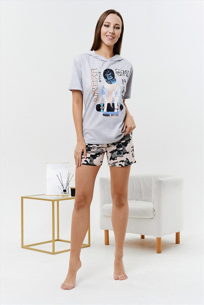 ID товара: 830601 Состав: 100% Хлопок Сезон: Демисезон Длина: Средняя Фасон: Прямой Рукав: Короткие Декоративные элементы: С капюшоном Основная ткань: Хлопок | Кулирка Стиль: Повседневный Страна бренда: Россия Страна производства: Россия Пижама женская с шортами. Футболка свободного кроя с капюшоном и оригинальной печатью на груди. Шорты с карманами, хорошо сидят на фигуре. Комментарии к товару