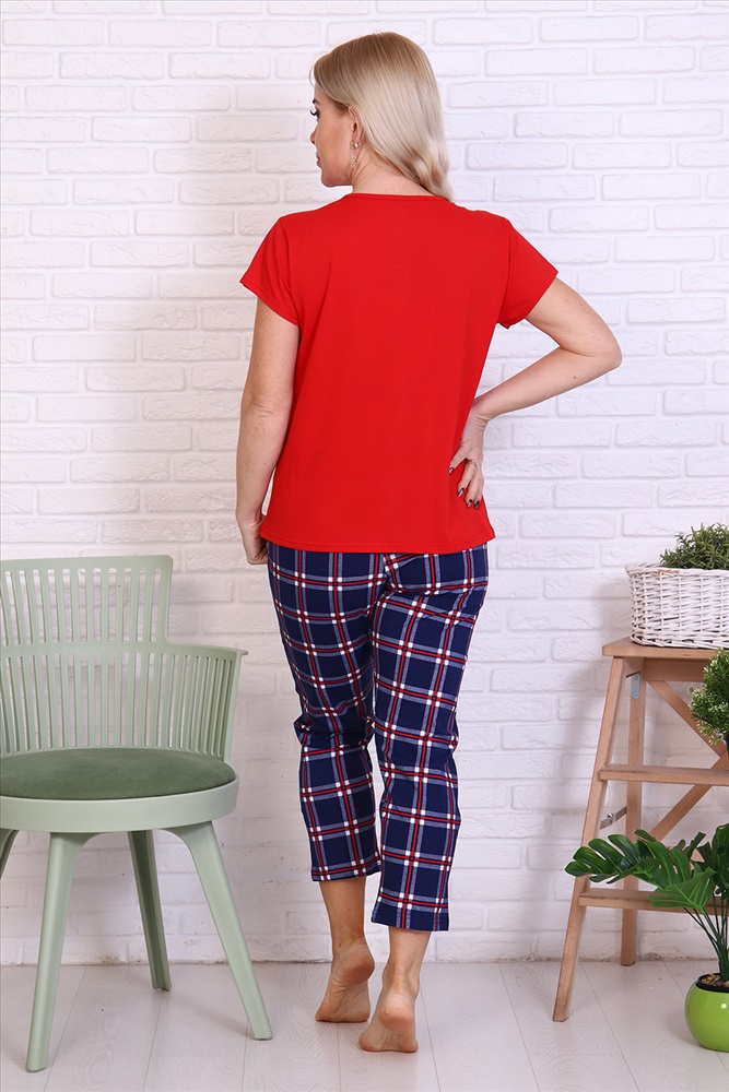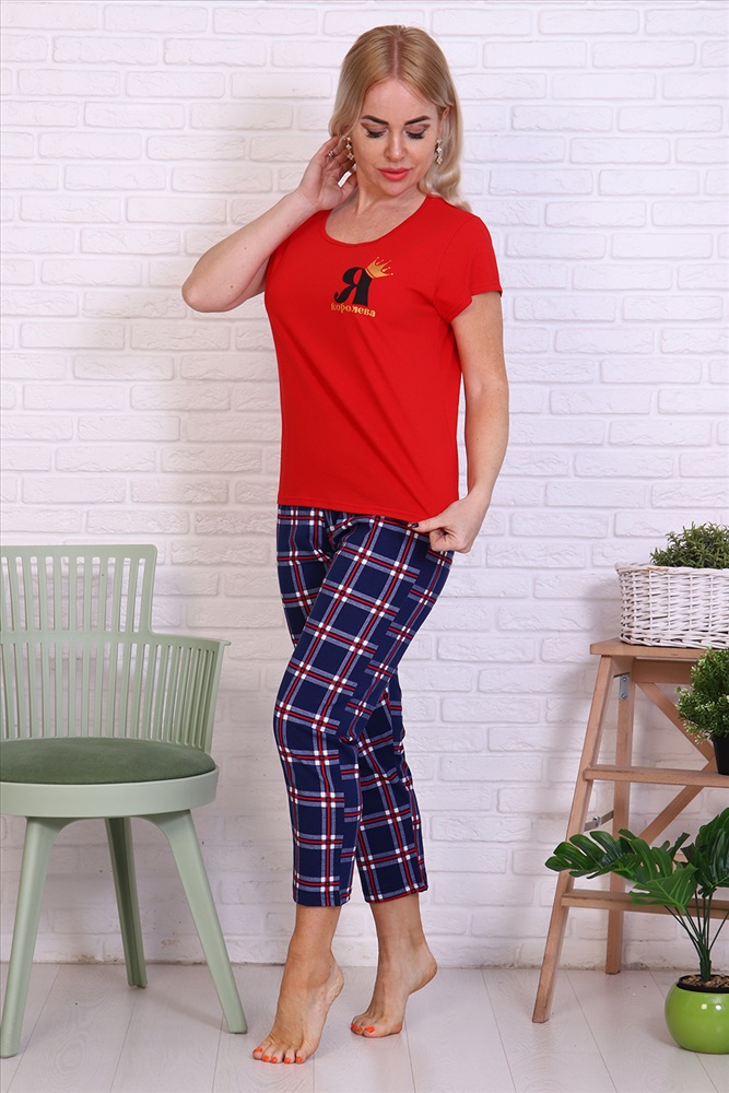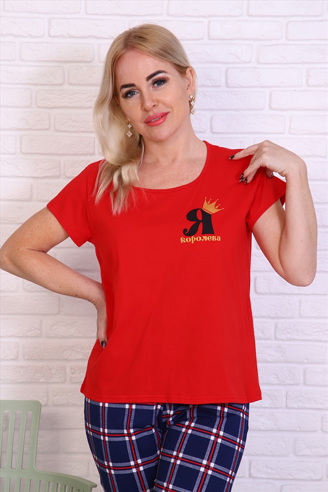 Состав: 100% хлопок Модель: Пижама 27322 Тип товара: пижама с брюками Материал: кулирка | кулирка Бренд: Натали Суслова Назначение: для дачи | для дома НДС: 5% Отделка: с печатью Рисунок: клетка | надпись Рукав: короткий рукав Сезонность: лето | осень | весна | зима Силуэт: прямой Стиль: домашний Женская пижама с укороченными брюками в клеточку. Футболка красного цвета с коротким рукавом, на полочке оригинальная печать в виде буквы с короной. Таблица размеров и весафутболка