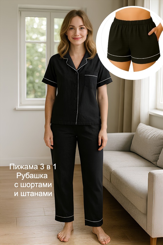 Универсальный комплект для сна и дома, который закрывает сразу несколько сценариев. В набор входят рубашка на пуговицах, брюки и шорты носите как полноценную пижаму или комбинируйте по сезону.
