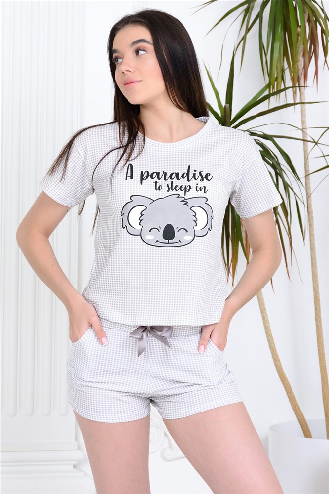 ID товара: 714603 Состав: 100% Хлопок Сезон: Демисезон Длина: Средняя Фасон: Прямой Рукав: Короткие Вид застежки: Шнурок Декоративные элементы: Принт Основная ткань: Хлопок | Кулирка Стиль: Повседневный Страна бренда: Россия Страна производства: Россия Пижама женская. Футболка выполнена из трикотажного полотна кулирка. Шорты с карманами Комментарии к товару