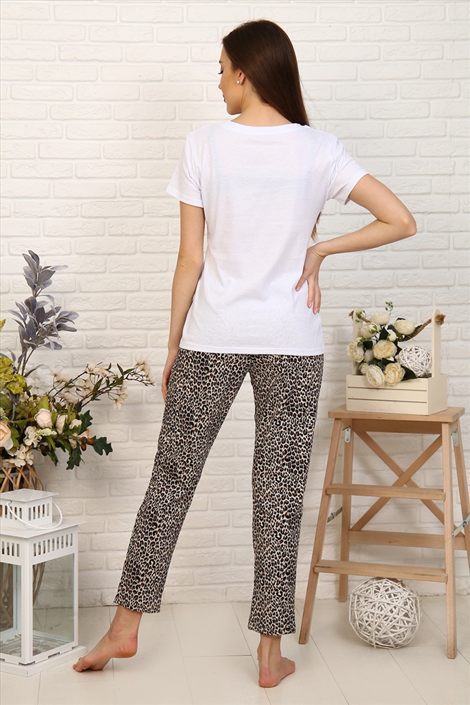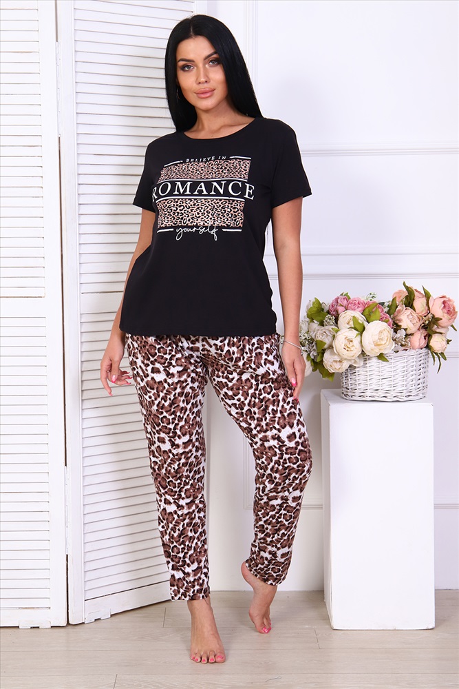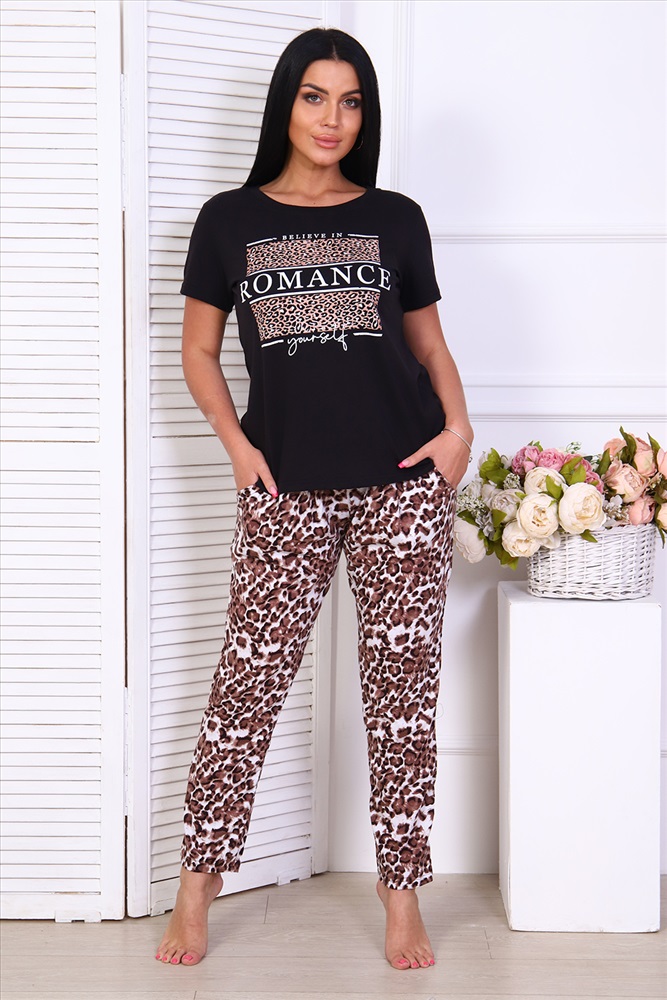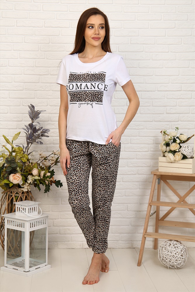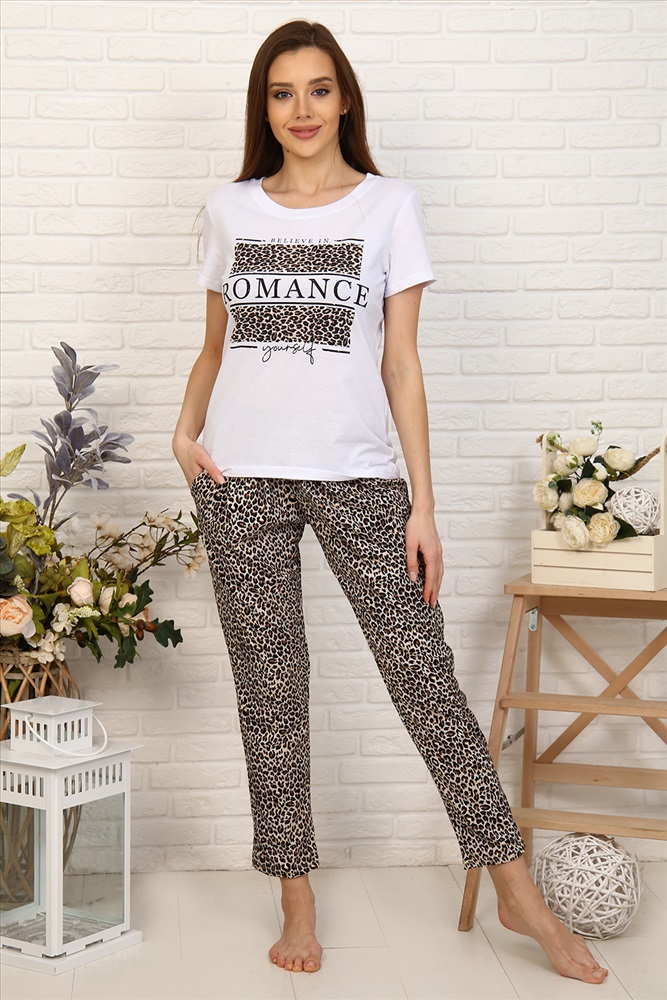 Состав: 100% хлопок Модель: Пижама 33503 Тип товара: пижама с брюками Материал: кулирка | кулирка Бренд: Натали Суслова Карман: боковые Назначение: для дома НДС: 5% Особенности: на резинке Отделка: с карманами | с печатью Рейтинг: Рейтинг 4 и выше Рисунок: анималистичный | крупный принт | надпись Рукав: короткий рукав Сезонность: осень | весна | зима Силуэт: полуприлегающий Стиль: домашний | молодежный Приятная к телу женская пижама из 100% хлопка. Лучший вариант для домашнего комфорта - натуральные ткани, яркий дизайн и в то же время универсальный стиль позволяет использовать этот костюм как домашний так, и прогулок в теплую приятную погоду. В комплект входят два изделия, сшитые из кулирки. Таблица размеров и весаБрюки