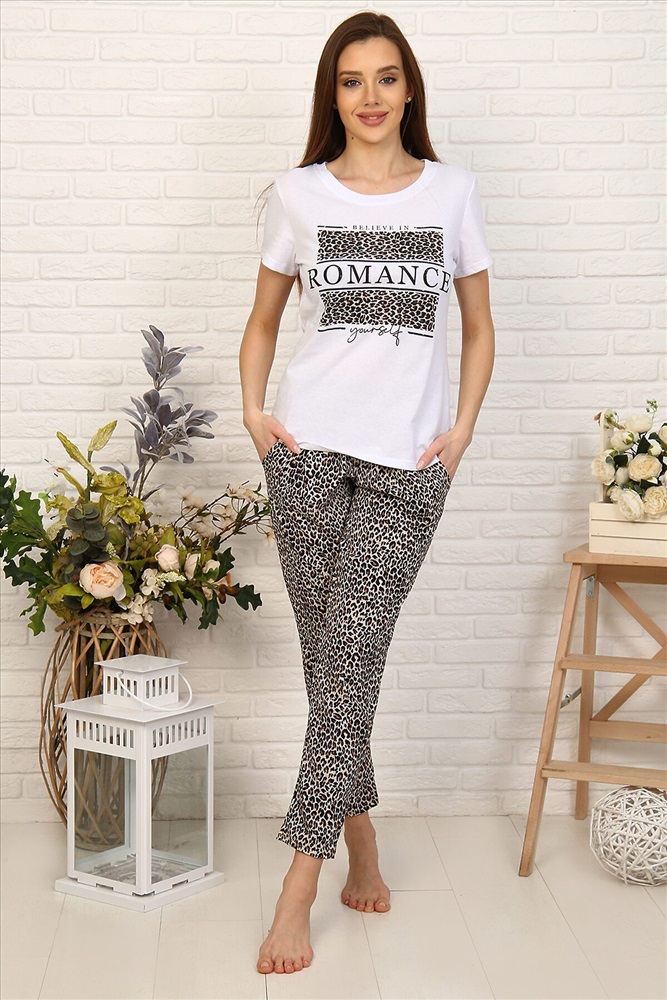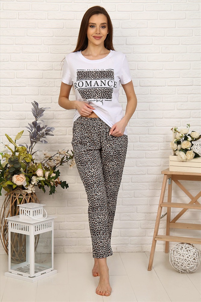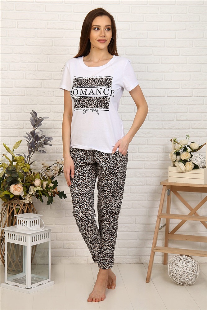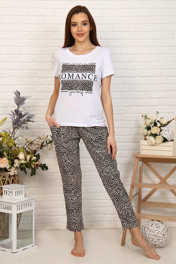 Приятная к телу женская пижама из 100% хлопка. Лучший вариант для домашнего комфорта - натуральные ткани, яркий дизайн и в то же время универсальный стиль позволяет использовать этот костюм как домашний так, и прогулок в теплую приятную погоду. В комплект входят два изделия, сшитые из кулирки.