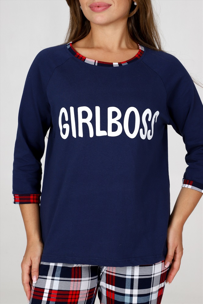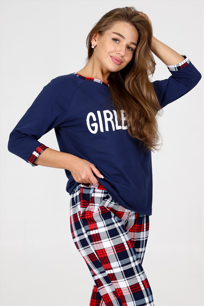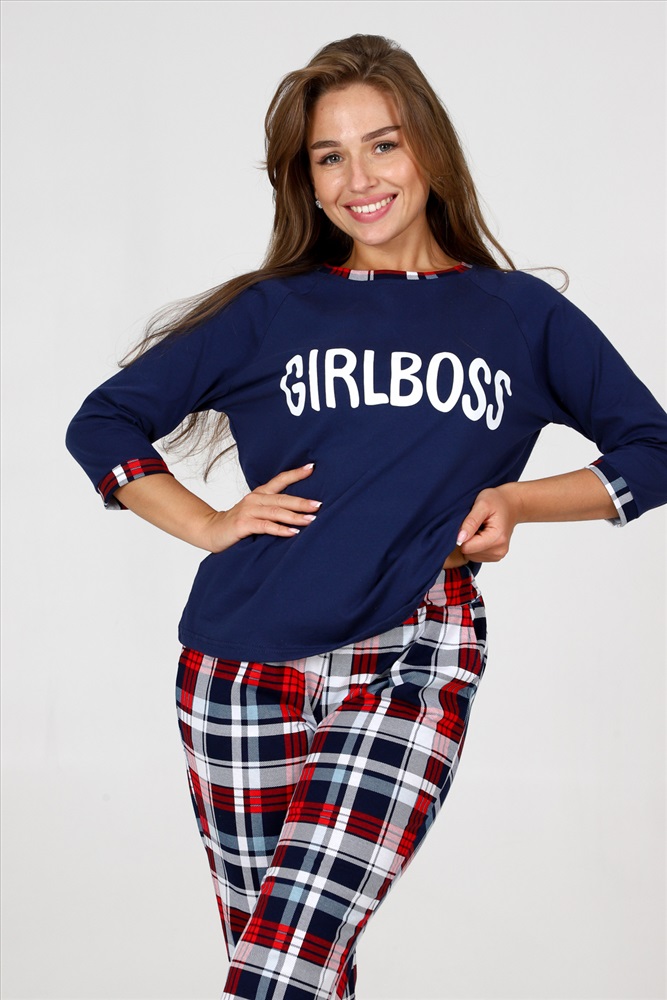 Стиль: домашний Пижама женская удобная и уютная вещь на каждый день. Джемпер с отделкой обтачки и манжеты контрастной тканью, стильная печать на груди, брюки зауженного кроя с карманами, манжеты внизу брюк.