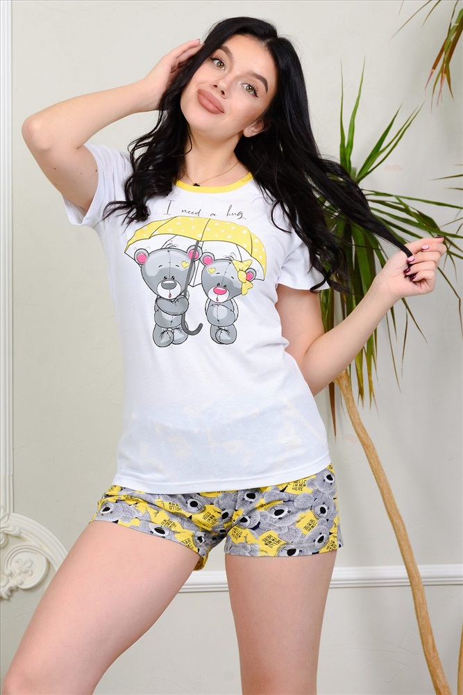ID товара: 715299 Состав: 100% Хлопок Сезон: Демисезон Длина: Средняя Фасон: Полуприлегающий Рукав: Короткие Вид застежки: Без застежки Декоративные элементы: Принт Основная ткань: Хлопок | Кулирка Стиль: Повседневный Страна бренда: Россия Страна производства: Россия Пижама с шортами на каждый день. Свободные шортики с карманами, на талии заложены по две мягкие складки с каждой стороны. Футболка из мягкого трикотажа, милый мимишный принт Комментарии к товару