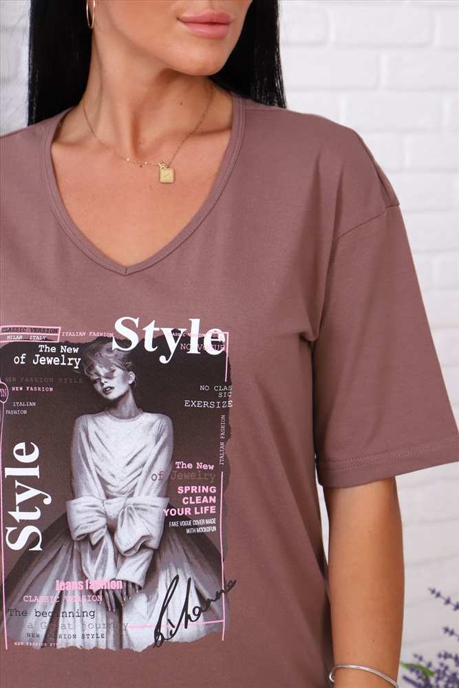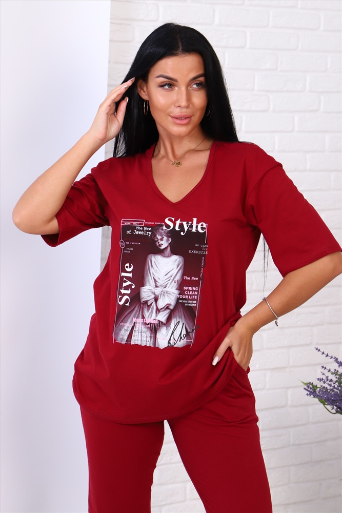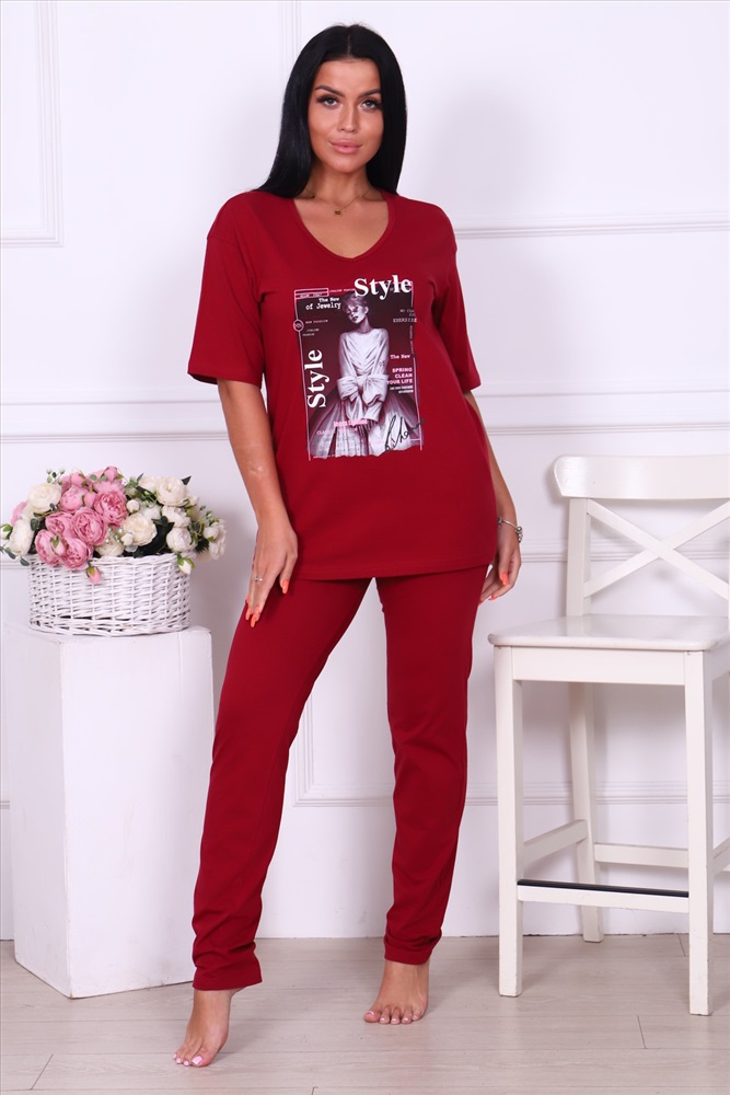Стиль: домашний Пижама женская: футболка с короткими рукавами, с крупным принтом на полочке и брюки с 2 карманами.