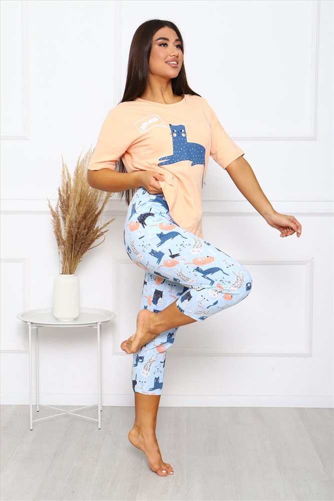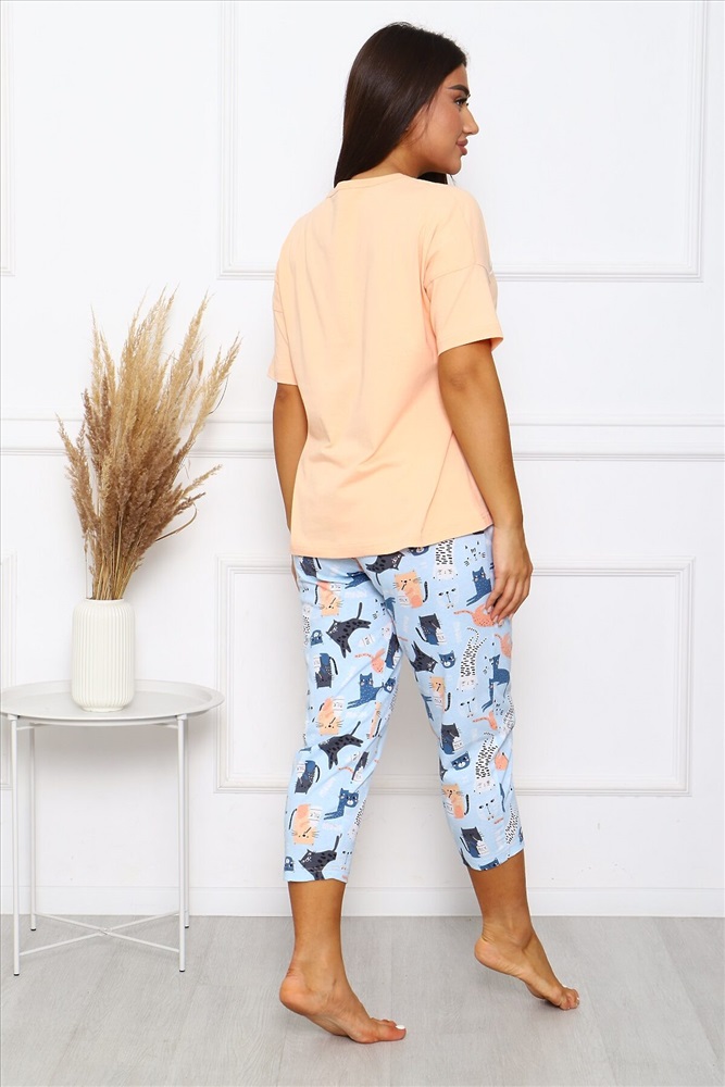 ID товара: 951185 Состав: Хлопок 100% Сезон: Демисезон Фасон: Прямой Рукав: короткие Основная ткань: Хлопок Стиль: Повседневный Вид ткани: Кулирка Страна бренда: Россия Страна производства: Россия Пижама женская Коты, с брюками, в боках карманы, футболка с коротким рукавом, свободного кроя, с милым принтом на полочке. Комментарии к товару