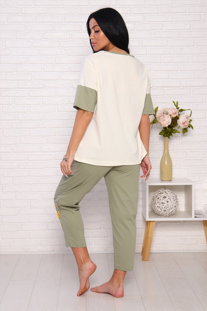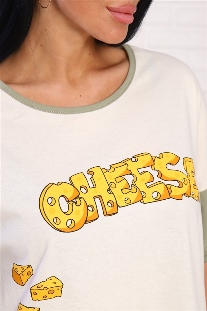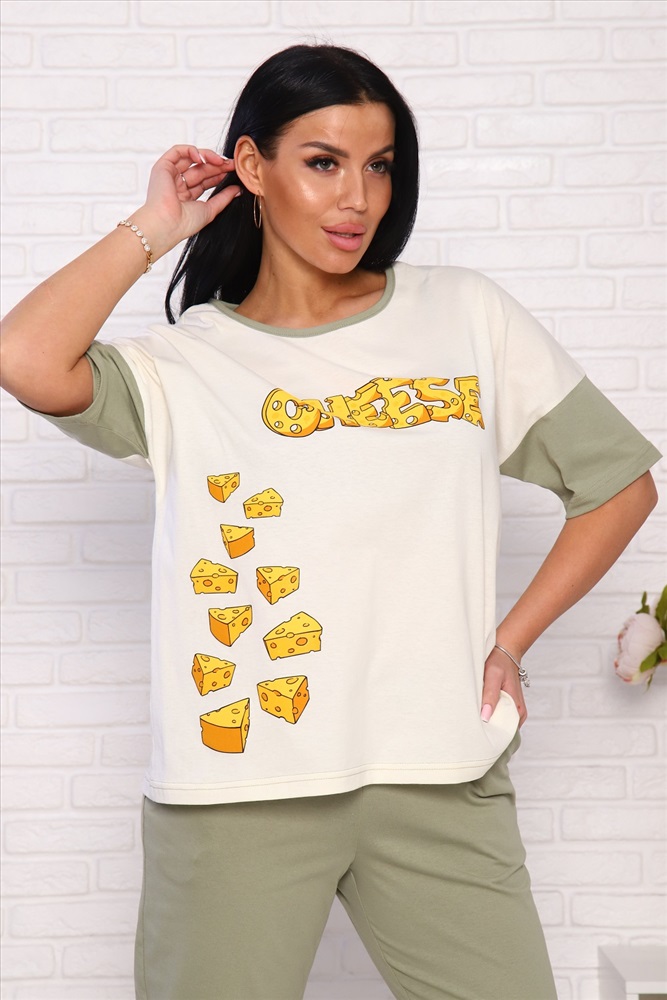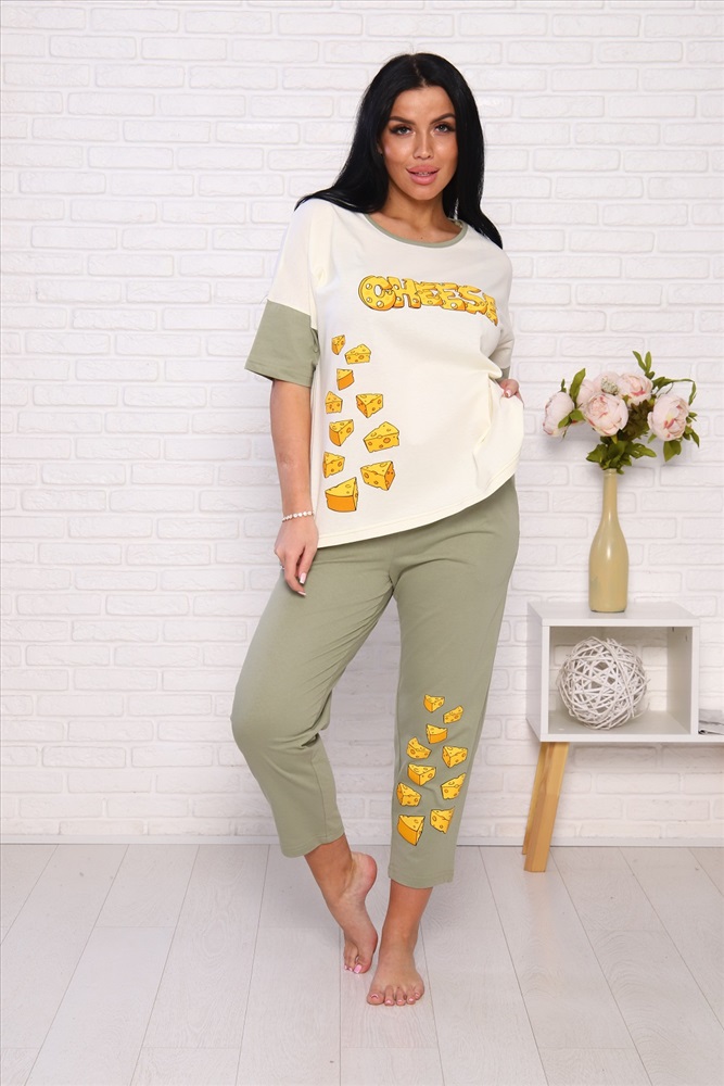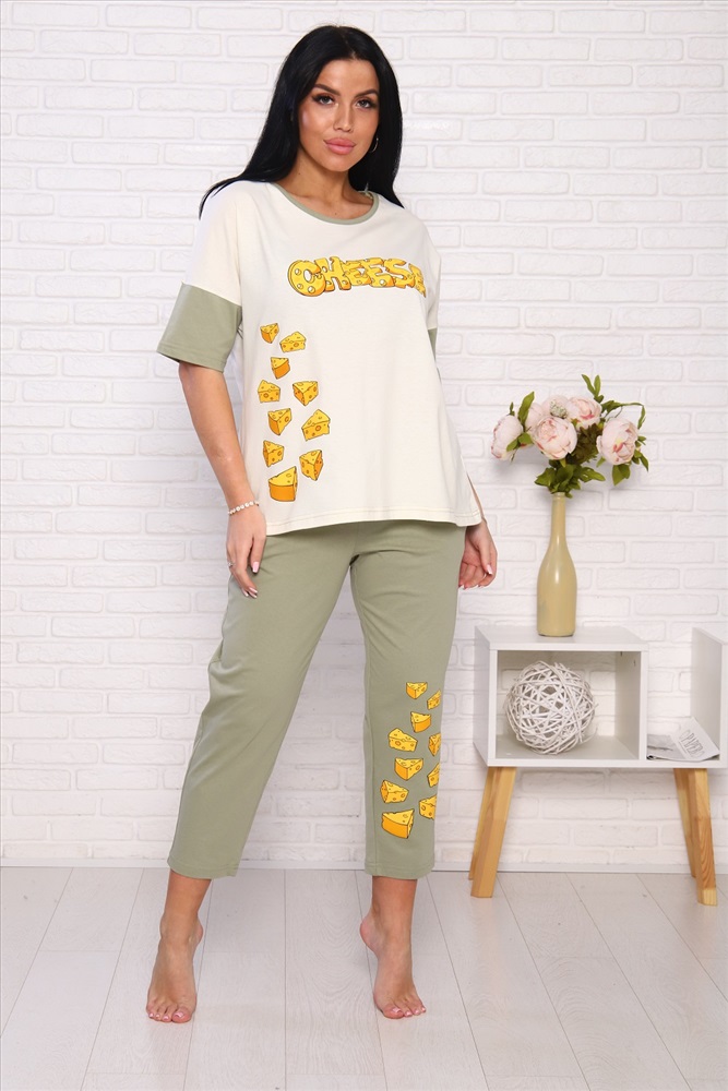 Застежка: без застежки Пижама женская Сыр: футболка с аппетитным принтом на груди и короткими рукавами, брюки длиной 7/8, прямые с карманами в боковых швах и на комфортном широком мягком поясе. 100% хлопок - комфорт и стиль.