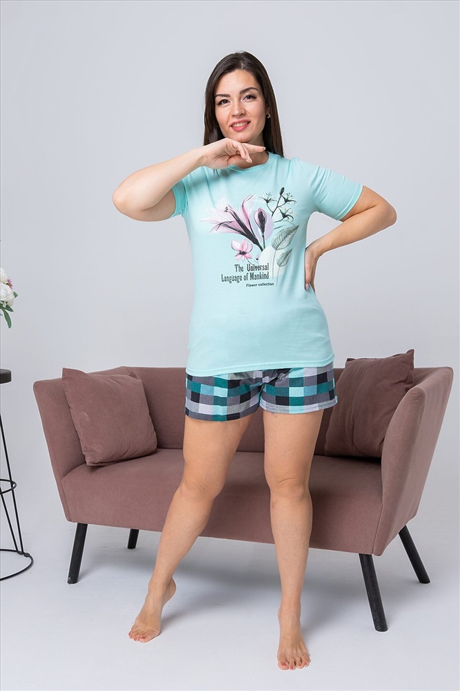 ID товара: 810734 Состав: 100% хлопок Сезон: Весна/Лето Длина: Средняя Фасон: Прямой Рукав: Короткий Вид застежки: Без застежки Декоративные элементы: Принт Основная ткань: Хлопок | Кулирка Стиль: Повседневный Страна бренда: Россия Страна производства: Россия Пижама женская состоит из футболки с коротким рукавом и шортов. Футболка из однотонной кулирки с красивым принтом, шорты свободного покроя из ткани кулирка набивка в клеточку. Пижама для сна и дома. После стирки не меняет цвет и форму. Комментарии к товару