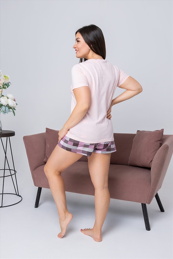 Страна производства: Россия Пижама женская состоит из футболки с коротким рукавом и шортов. Футболка из однотонной кулирки с красивым принтом, шорты свободного покроя из ткани кулирка набивка в клеточку. Пижама для сна и дома. После стирки не меняет цвет и форму.