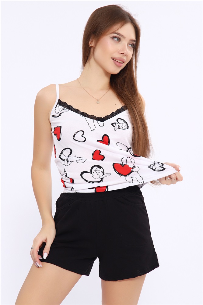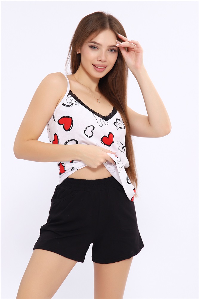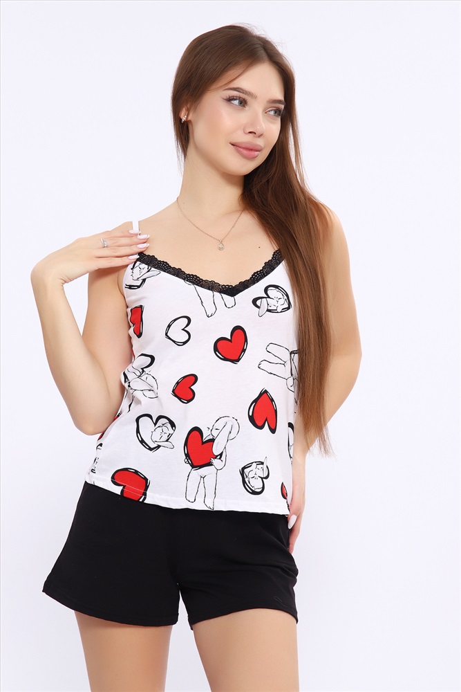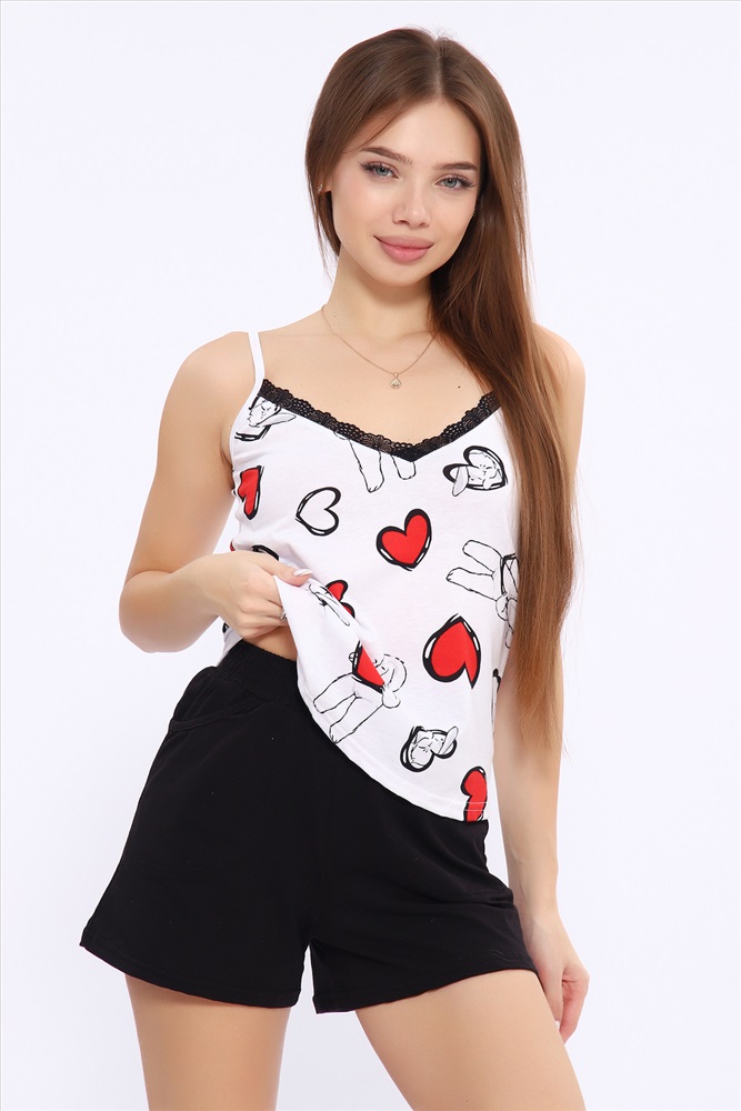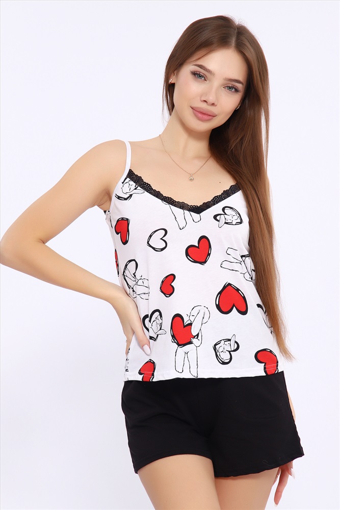 Состав: хлопок 100% Модель: Пижама 88103 Тип товара: пижама с шортами Материал: кулирка | кулирка Бренд: Натали Суслова Карман: боковые Назначение: для дома НДС: Без НДС Особенности: на резинке Отделка: с карманами | с кружевом Посадка: средняя посадка Рисунок: сердечки Рукав: без рукава Сезонность: лето | осень | весна | зима Силуэт: полуприлегающий | свободный Скидка: любая | от 10% и больше | от 30% и больше Стиль: домашний Воротник: без воротника Застежка: без застежки Пижама женская шорты и топ. Данная модель выполнена из трикотажного полотна кулирка (ХЛОПОК 100%). Топ с V-образным вырезом украшен эластичным кружевом. Шорты с поясом и карманами. Отличная модель для сна и отдыха. Таблица размеров и весашорты