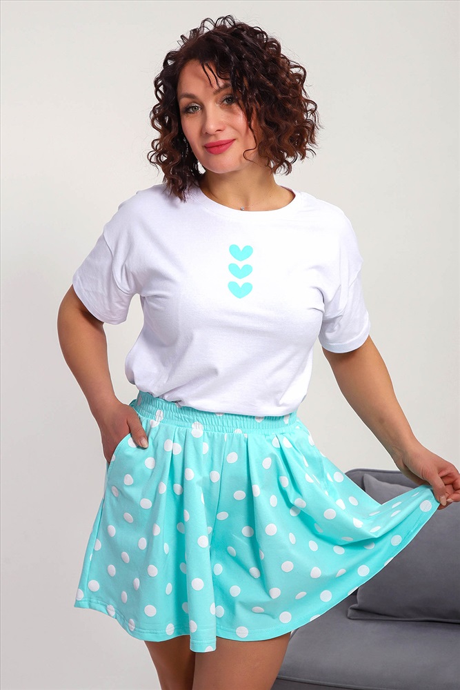 Состав: хлопок 96%, лайкра 4% Модель: Пижама 88145 Тип товара: пижама с шортами Материал: кулирка | кулирка с лайкрой | кулирка | кулирка с лайкрой Бренд: Натали Суслова Карман: боковые | прорезные Назначение: для дома НДС: Без НДС Особенности: на резинке Отделка: с карманами Посадка: высокая посадка Рисунок: горошек | сердечки Рукав: короткий рукав Сезонность: лето | осень | весна | зима Силуэт: свободный Стиль: домашний Воротник: без воротника Застежка: без застежки Пижама женская с шортами-юбка и футболкой со спущеным рукавом. Данная модель выполнена из эластичного трикотажного полотна кулирка ( хлопок 96%, лайкра 4%). На футболке присутствует принт. Шорты с поясом и карманами. Складки на шортах придают воздушность и комфорт, свобода в движениях. Пижама порадует вас. Таблица размеров и весафутболка