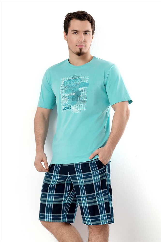 Страна производства: Россия Набор мужской для дома состоящий из футболки и шорт. Футболка из однотонной кулирной глади с круглым вырезом горловины, коротким рукавом и дизайнерским принтом. Шорты из набивного поплина на эластичном поясе с функциональными карманами и шнуром.