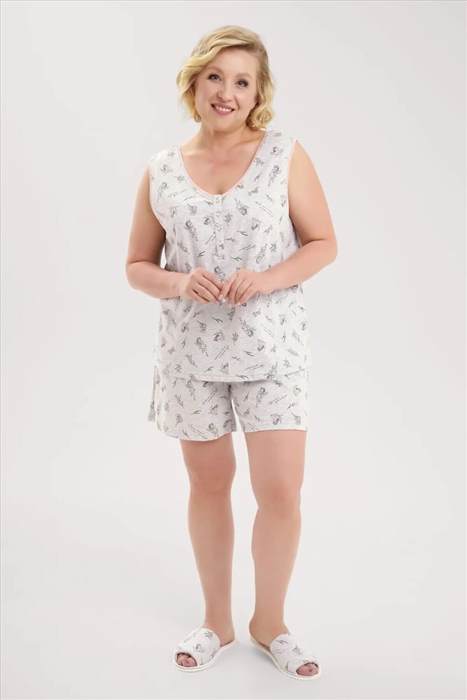 Страна производства: Россия Пижама из трикотажного полотна. Майка прямого силуэта. V-образная горловина, средняя ширина плеча. По горловине и пройме контрастная обтачка. По переду притачная планка с застежкой на пуговицы. Шорты на внутренней резинке.
