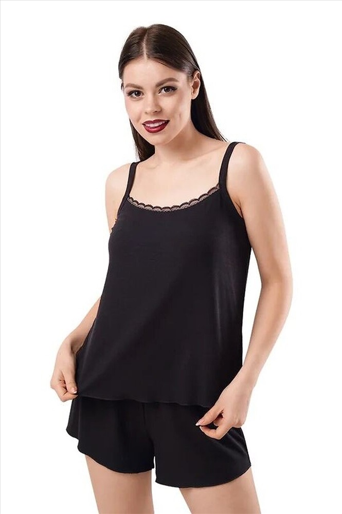 Страна производства: Россия Пижама для дома и отдыха из вискозного трикотажного полотна кашкорсе лапша. Майка прилегающего силуэта, узкая бретель. Спереди по горловине кружево, по спинке окантовка. Шорты по талии пояс на внутренней резинке. По низу майки и шорт узкий оверлок.