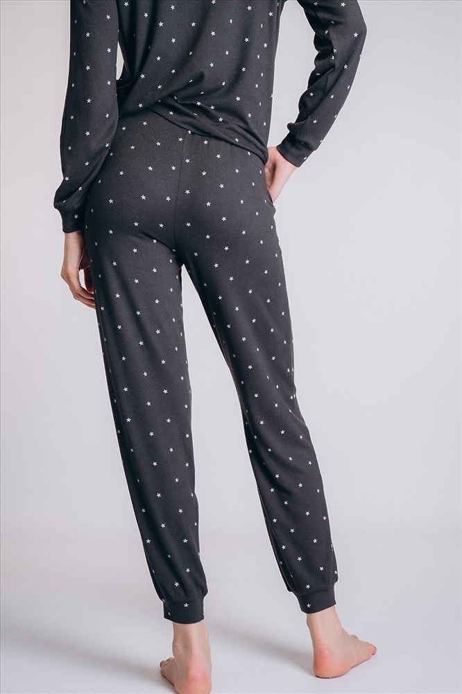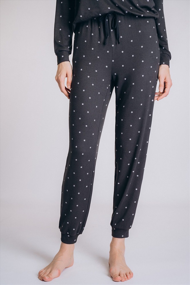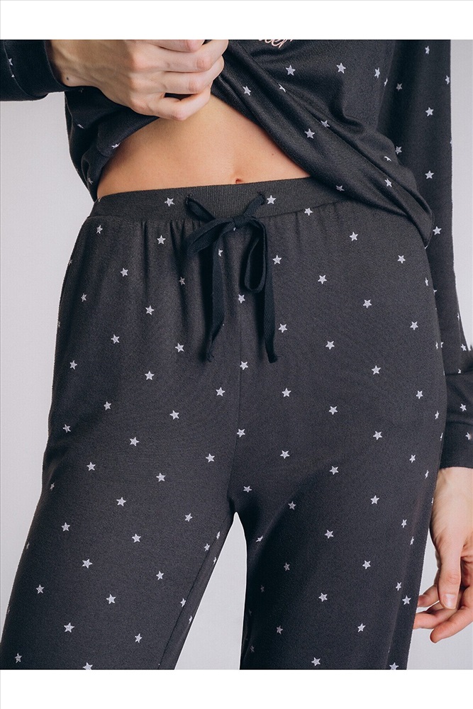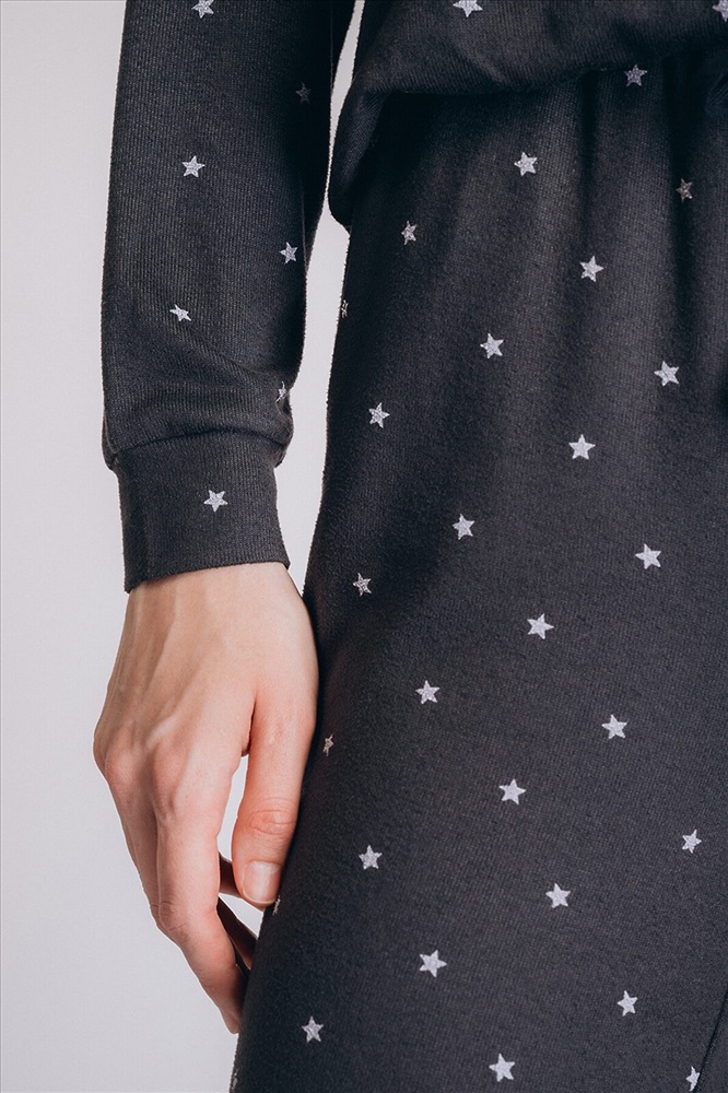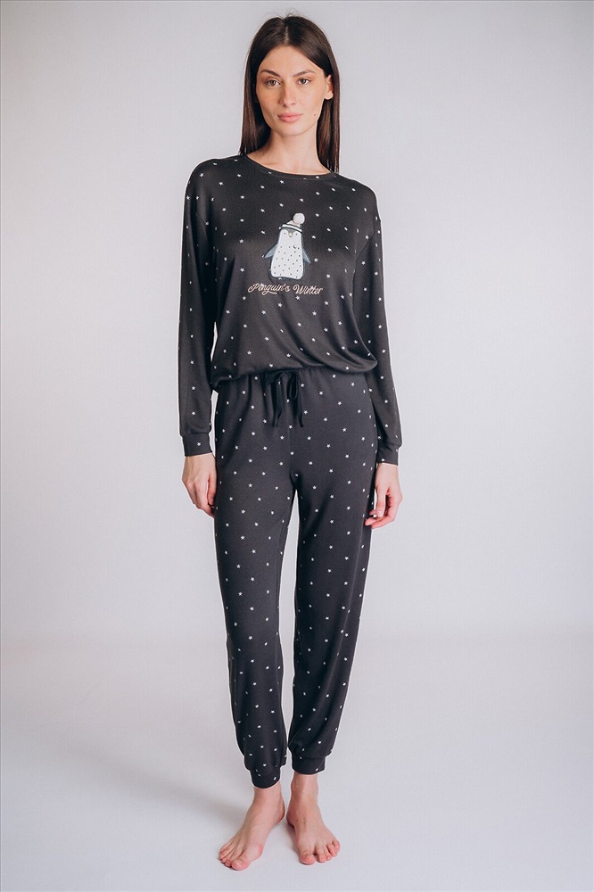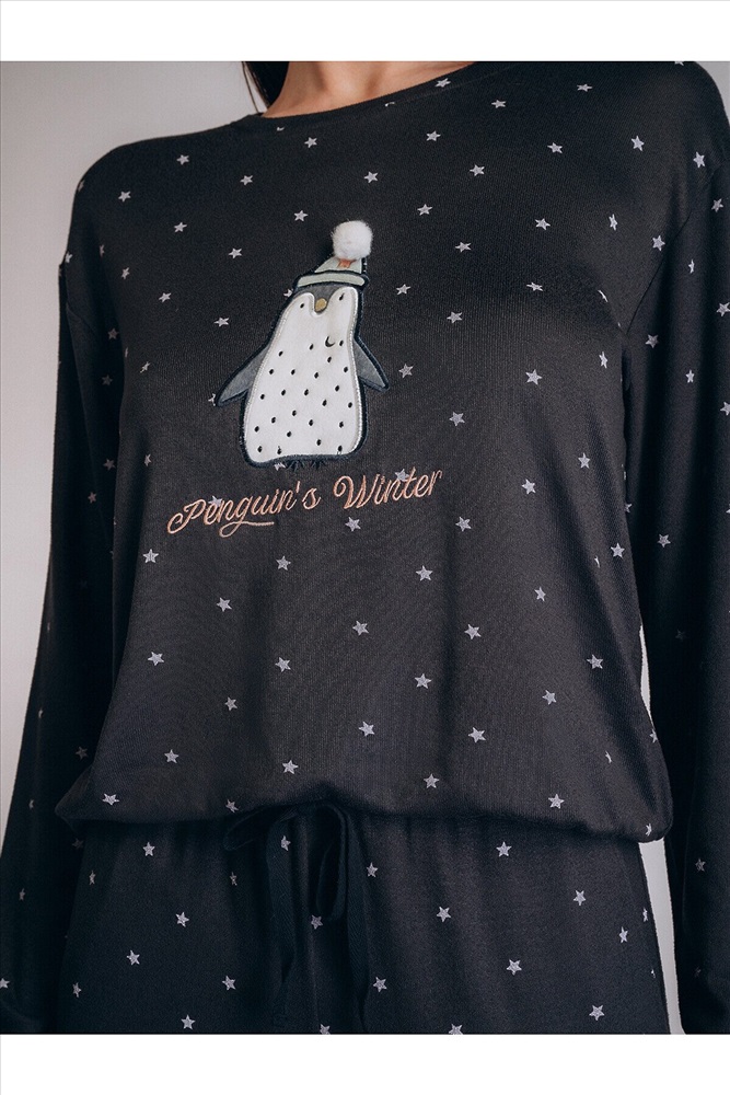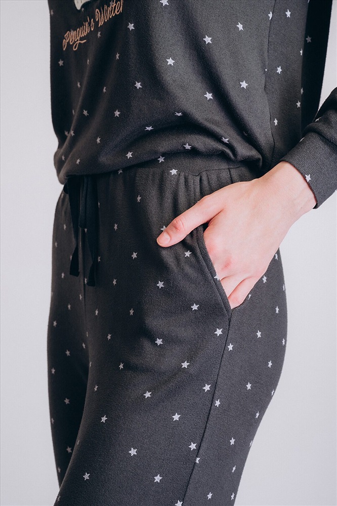 Женская пижама от бренда Indefini — это сочетание уюта, мягкости и зимнего настроения. Комплект выполнен в тёмно-сером цвете с изысканным принтом из мелких белых звёзд и изображением пингвина в шапке с надписью «Penguin’s Winter», что придаёт образу нотку тепла и игривости. Особенности: Манжеты на низу брюк — плотно облегают ноги, сохраняя тепло и предотвращая попадание холодного воздуха. Боковые карманы — практичные и удобные, позволяют хранить мелкие вещи (ключи, телефон, пульт) без дискомфорта. Регулируемый пояс с шнурком позволяет точно подогнать изделие под талию, обеспечивая максимальный комфорт и удобство в течение всей ночи. Комплект отличается универсальным кроем, который подойдёт для разных типов фигур, и идеально подходит для прохладных вечеров, зимних ночей или просто для тех, кто любит ощущать себя в тепле и комфорте.