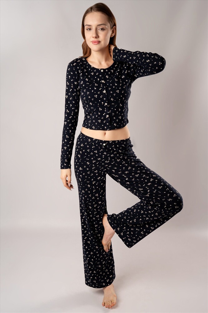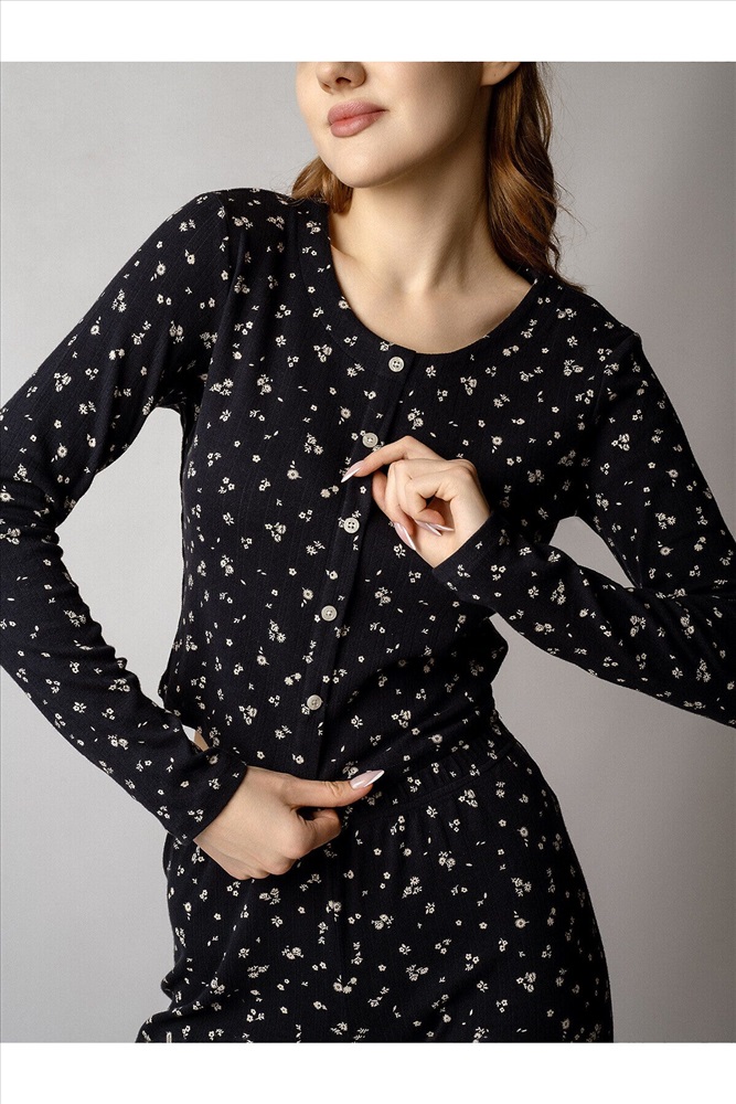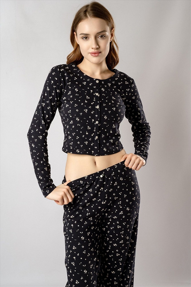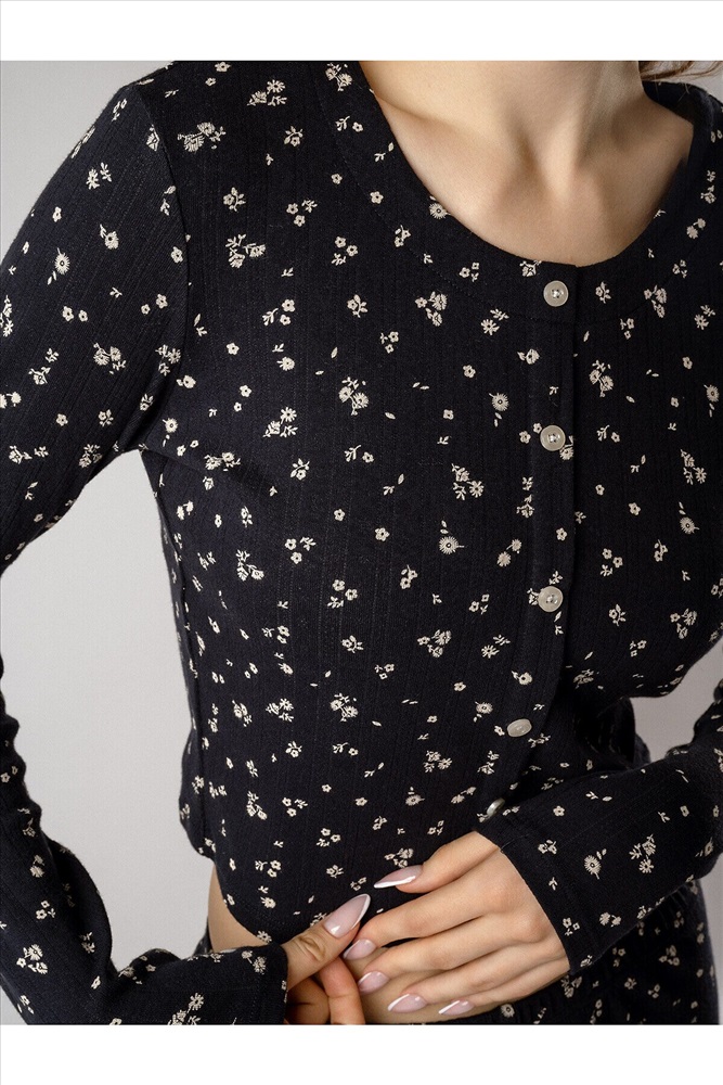 ID товара: 1225155 Состав: 95% Хлопок 5% Эластан Сезон: Демисезон Длина: Полная Фасон: Полуприлегающий Рукав: Длинные Декоративные элементы: Принт Основная ткань: Хлопок Страна бренда: Россия Страна производства: Китай Кофта с длинными рукавами украшена рядом декоративных пуговиц на груди. Брюки дополнены «розочкой» на поясе — выразительным элементом, который придает модели романтичный характер. Глубокий чёрный цвет в сочетании с нежным цветочным принтом создаёт утончённый образ, гармонично соединяя сдержанную элегантность и женственность. Комментарии к товару