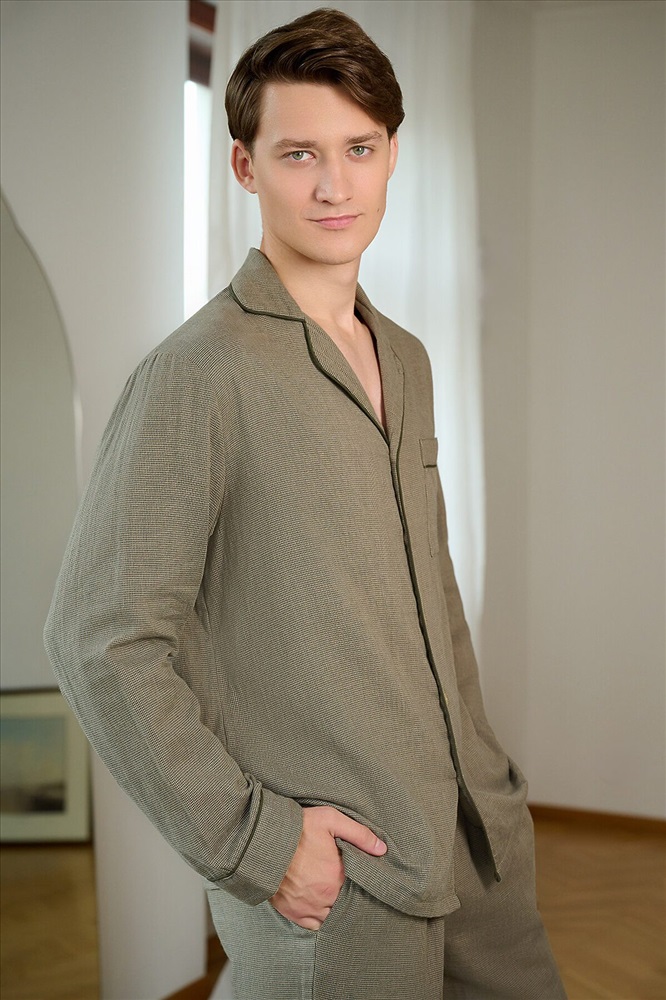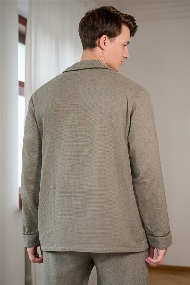 ID товара: 1231597 Состав: 100% Хлопок Сезон: Весна/Лето Рукав: Длинные Страна бренда: Россия Страна производства: Китай Мужская пижама Indefini (Арт. 5013PCC) выполнена из 100% хлопка. В комплект входит рубашка и брюки оливкового цвета с мелким текстурным узором. Рубашка свободного кроя с длинными рукавами, отложным воротником и пуговицами спереди. На груди расположен накладной карман. Брюки прямого кроя на мягкой резинке с шнурком для регулировки посадки, имеют удобные боковые карманы. Пижама идеально подходит для домашнего отдыха и сна, обеспечивая комфорт и приятные тактильные ощущения. Параметры модели на фото: 100-80-106 Рост модели на фото: 188 см Размер изделия на модели: M Комментарии к товару