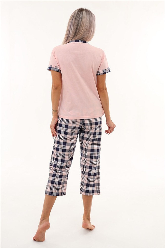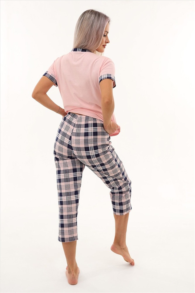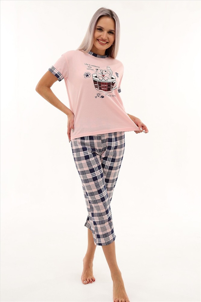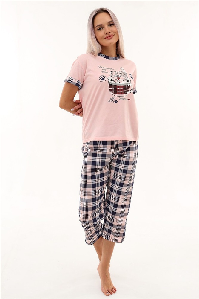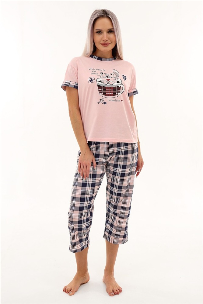ID товара: 980323 Состав: Хлопок 100% Сезон: Весна/Лето Фасон: Прямой Рукав: Короткие Крой брючин: Прямой Рисунок: Клетка Вид ткани: Кулирка Страна бренда: Россия Страна производства: Россия Уютная пижама с оригинальным принтом из очень мягкой, приятной к телу ткани. Футболка с спущенной линией плеча. Бриджи свободного кроя. В измерениях в обхвате талии указана длина резинки. Может использоваться как домашний костюм. Комментарии к товару