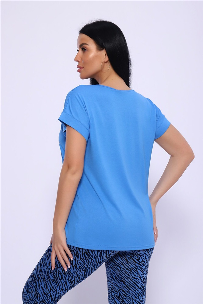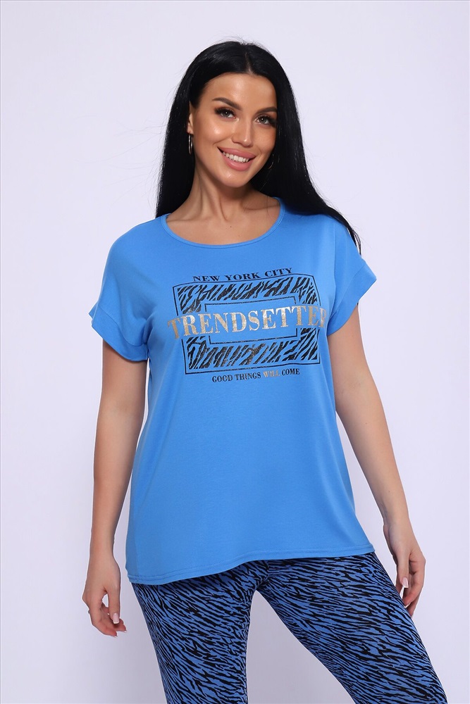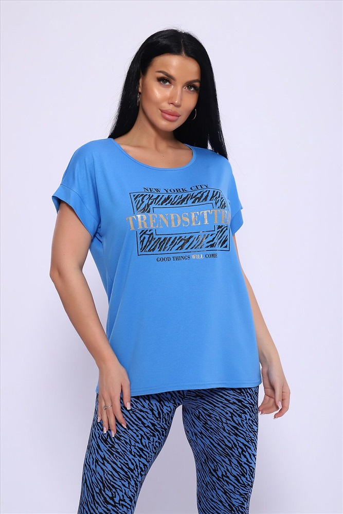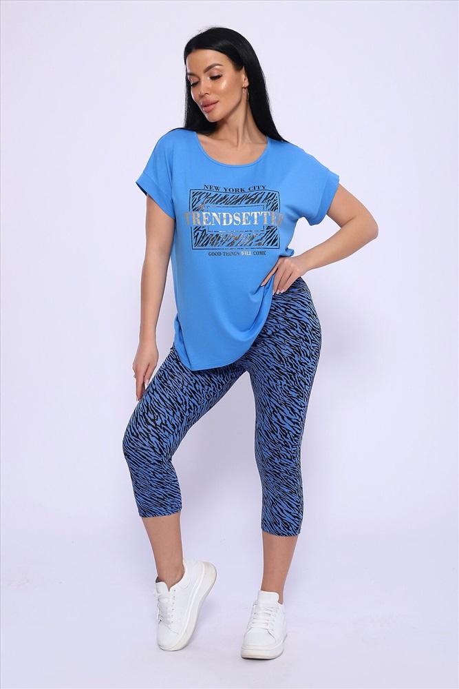 Модель состоит из свободной футболки с красивым поблескивающим принтом и бридж прилегающего силуэта. Костюм из комфортной дышащей вискозы, подойдёт и для дома, дачи и на отдыхе.