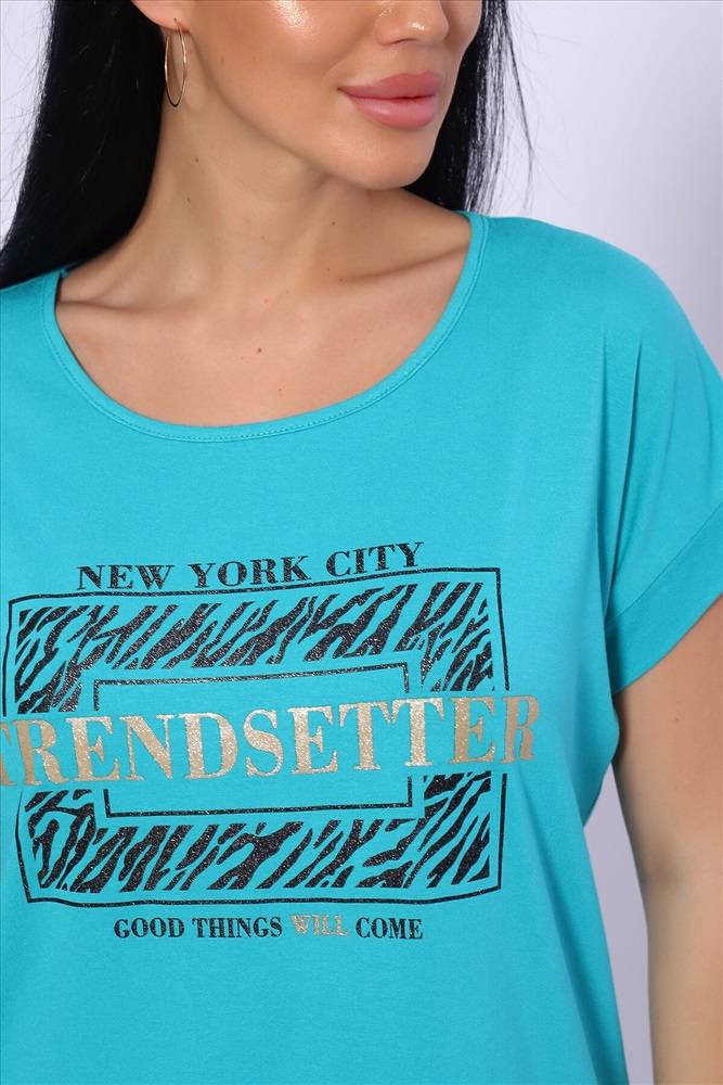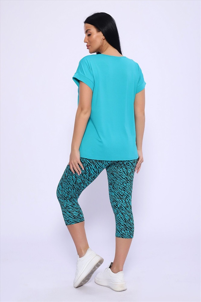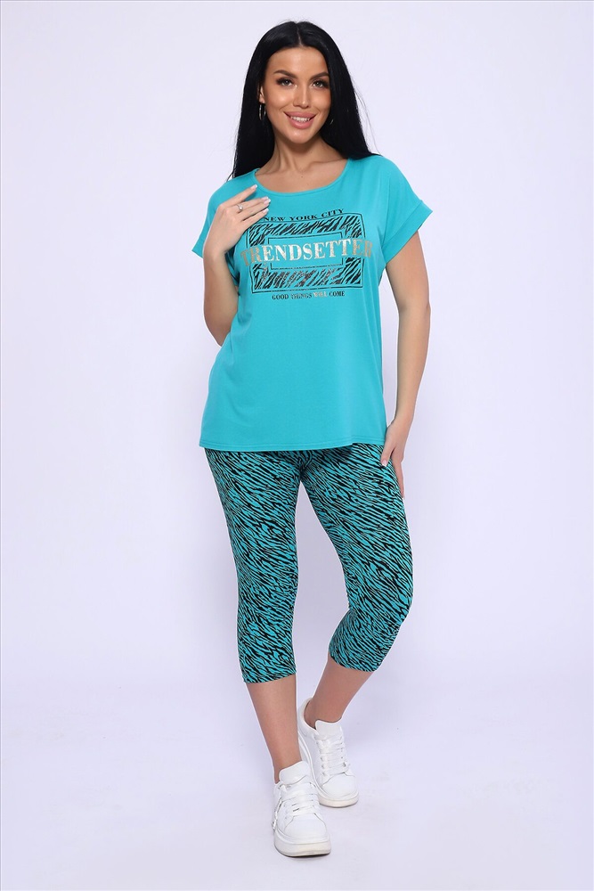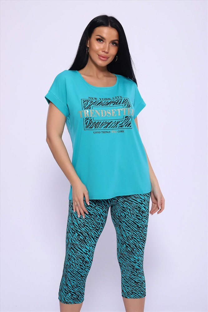 Модель состоит из свободной футболки с красивым поблескивающим принтом и бридж прилегающего силуэта. Костюм из комфортной дышащей вискозы, подойдёт и для дома, дачи и на отдыхе.