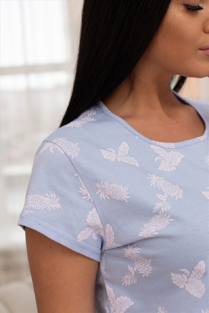 Страна производства: Россия Женская пижама с бриджами. Футболка с коротким рукавом из красивой ткани в виде ананасов. Бриджи из ткани в клетку. Очень красиво смотрится на любой фигуре, придает ей нежный вид.