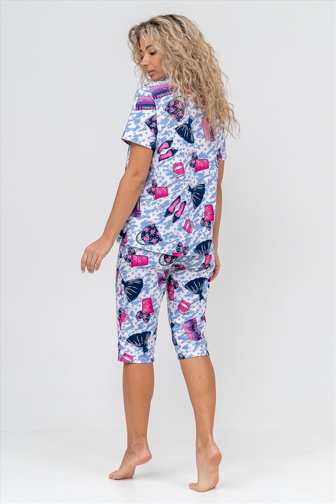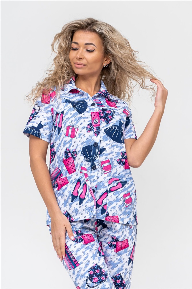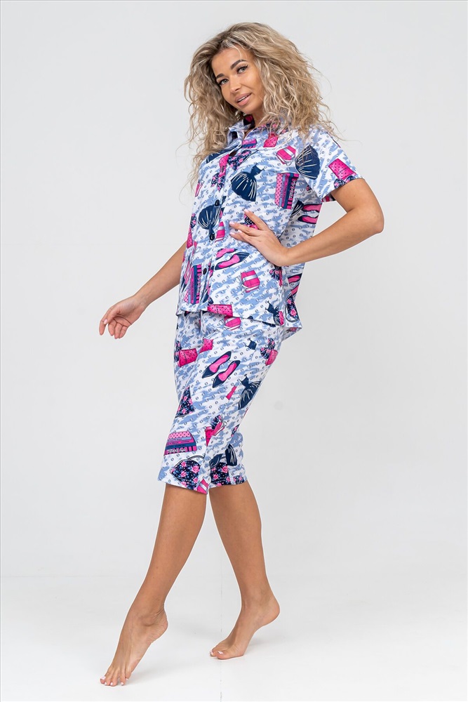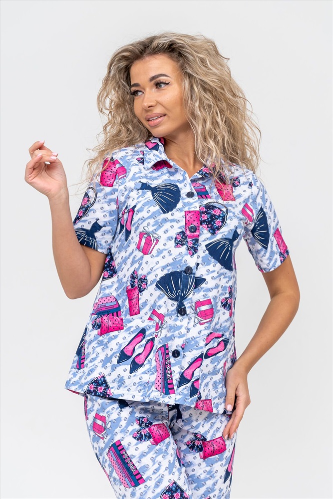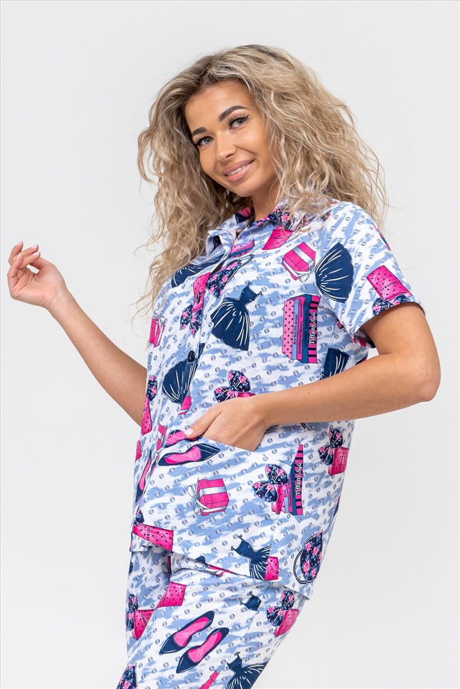 ID товара: 956768 Состав: 100% Хлопок Сезон: Демисезон Длина: Средняя Фасон: Прямой Рукав: короткие Основная ткань: Хлопок Стиль: Повседневный Вид ткани: Кулирка Страна бренда: Россия Страна производства: Россия Женская пижама - это идеальная одежда свободного покроя для дома. Состоит из 100% хлопка, не скатывается и сохраняет форму и цвет после множества стирок. Наша модная пижама с бриджами отлично подходит как белье для сна, повседневной носки или фотосессии. Набор двойка выполнен из верха рубашечного плана с воротником, планкой на пуговицах, двумя накладными карманами и бриджами на резинке. Лето, Весна, Осень, Зима - каждый день будет окутан уютом. Удобный трикотажный пижамный костюм предоставит вам крепкий комфортный сон и молодежный стильный вид. Если предпочитаете оверсайз (oversize), то возьмите на размер больше. Наша домашняя одежда прекрасно смотрится на стройных и на полных, на высоких и на миниатюрных. Также данный костюм с бриджами подойдет и для беременных на ранних сроках. Вы можете заказать стильный и приятный новогодний подарок в виде пижамы: жене, для мамы, дочки, девушки, девочки подростка, любимой, для сестры, подруги или бабушки. Вы можете сделать сюрприз на любой праздник: на Новый Год, Рождество, 8 марта, День Святого Валентина, День Матери, День Рождения. И будьте уверены, что она станет вашим любимым элементом гардероба! Комментарии к товару