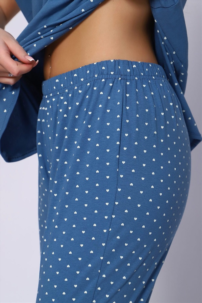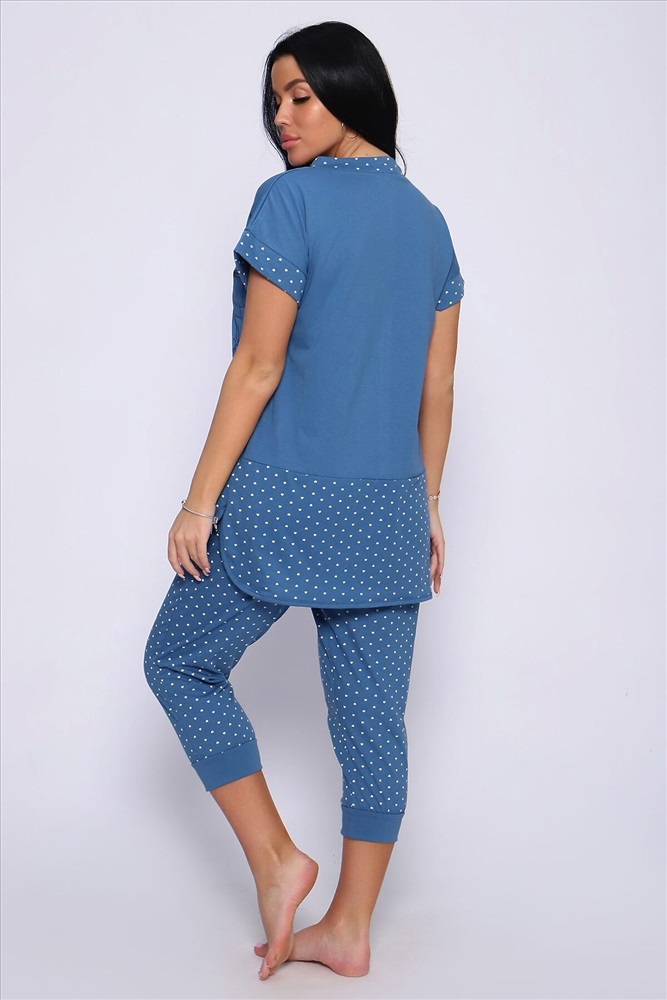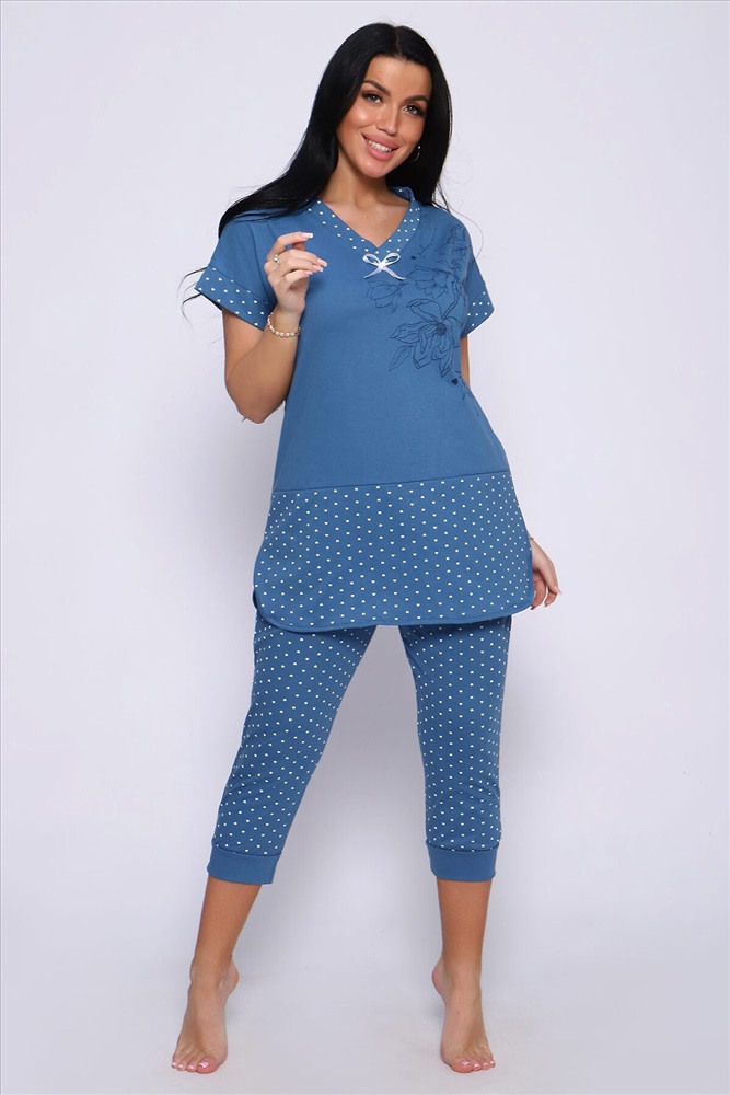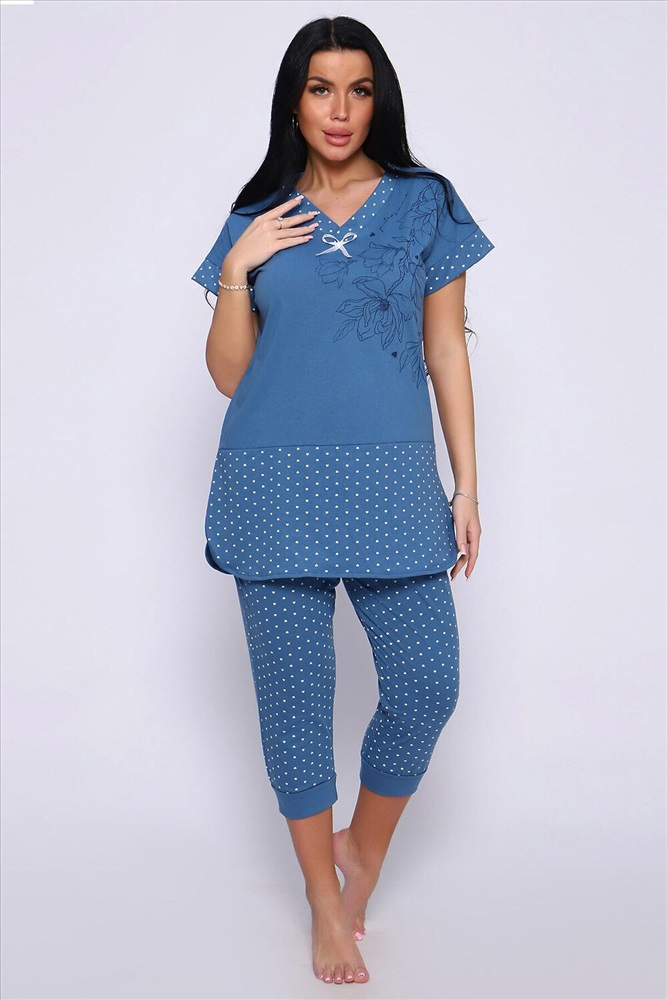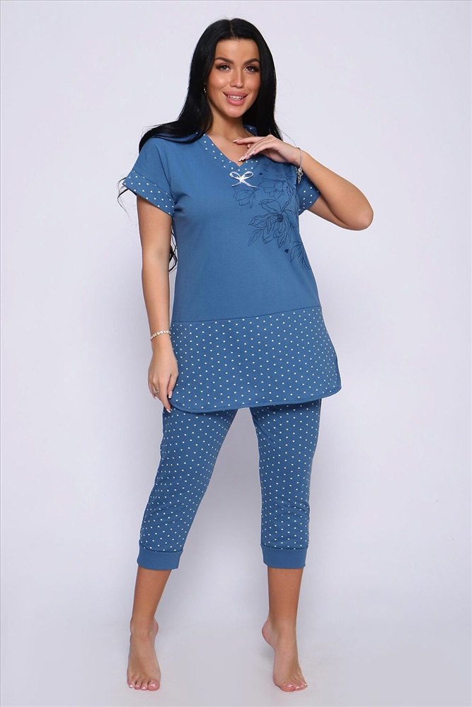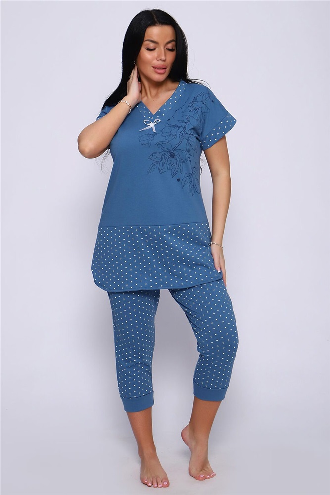 Пижама из хлопковой кулирки, свободного покроя, состоит из туники и бриджей. Передняя часть полочки с цветочным принтом, бриджи без карманов, низ на манжете.