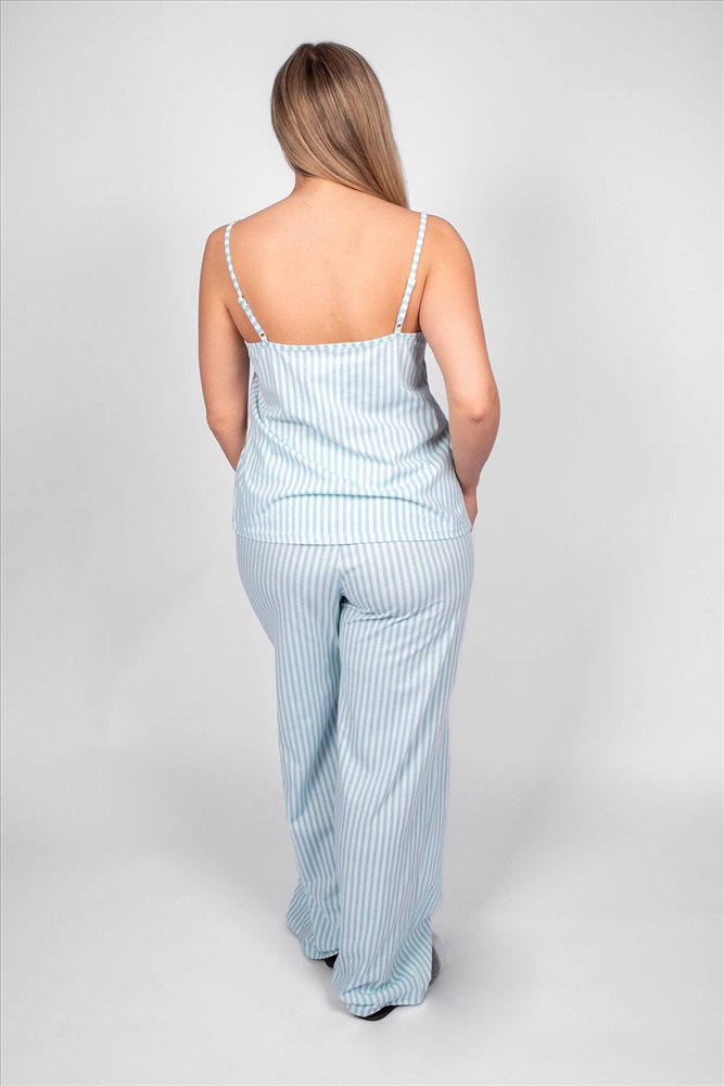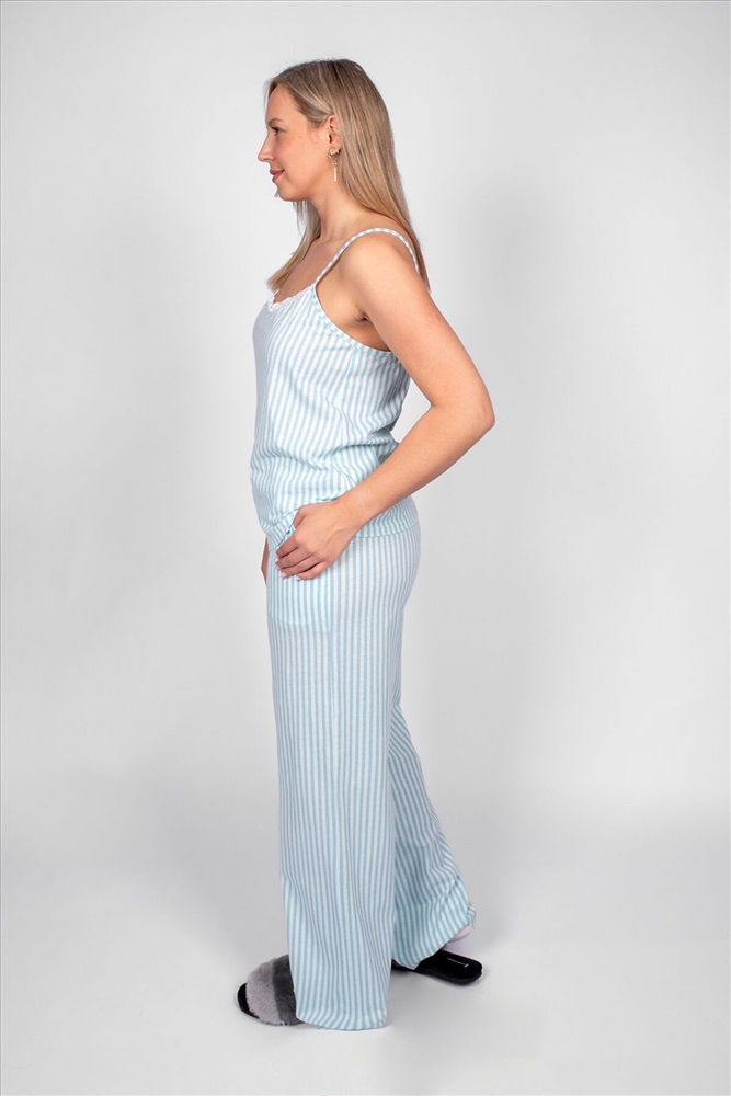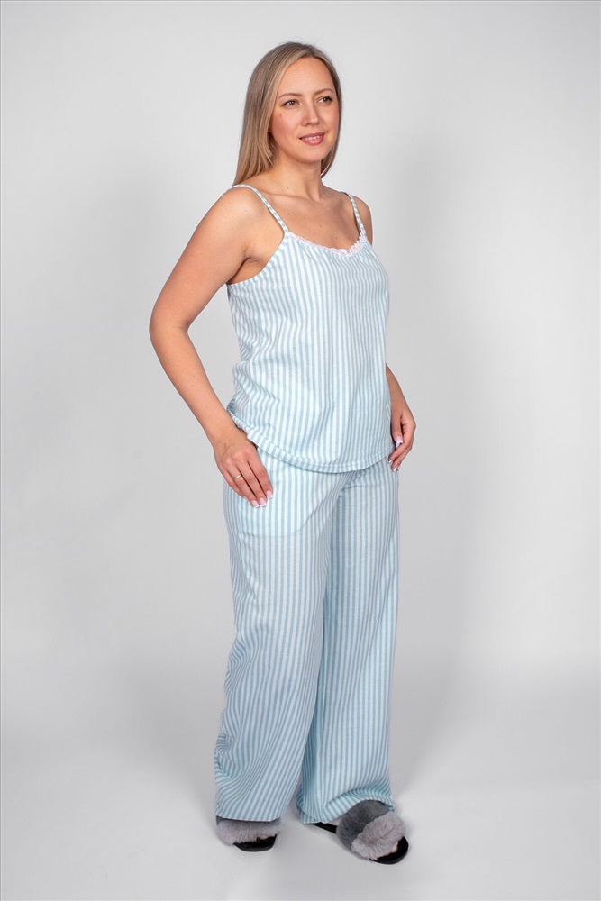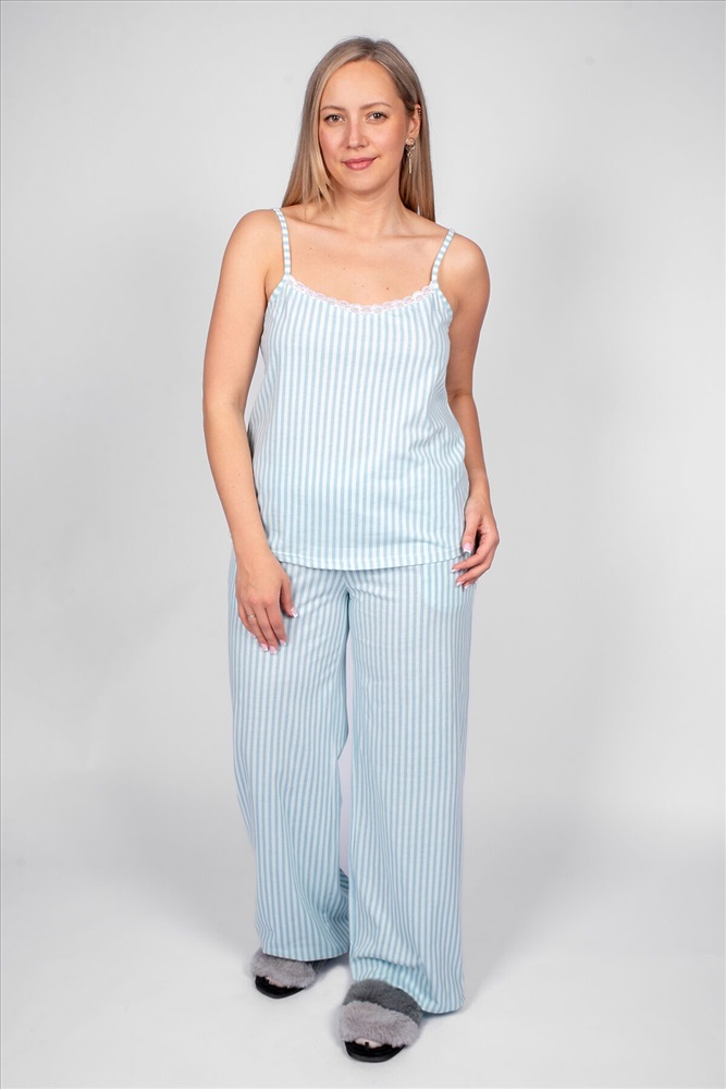 ID товара: 1018607 Состав: 100% Хлопок Сезон: Весна/Лето Фасон: Прямой Рукав: Без рукавов Крой брючин: Прямой Рисунок: Полоска Вид ткани: Кулирка Страна бренда: Россия Страна производства: Россия Пижама женская, состоящая из майки на брителях и брюк. Майка женская прямого силуэта с кружевом по линии декольте, из набивного полотна. Бретели регулируемые, 2 колечка и 2 пряжки белого цвета. По линии проймы и горловины притачено кружево белого цвета. Брюки из набивного полотна, силуэт палаццо. Пояс отрезной, выполнен из основного полотна в цвет изделия, с эластичной тесьмой внутри, закрепленной в шов. На передней половинке брюк выполнены карманы с отрезным бочком. Низ изделия обработан швом в подгибку. Модель рассчитана на рост 170-176 см. Комментарии к товару