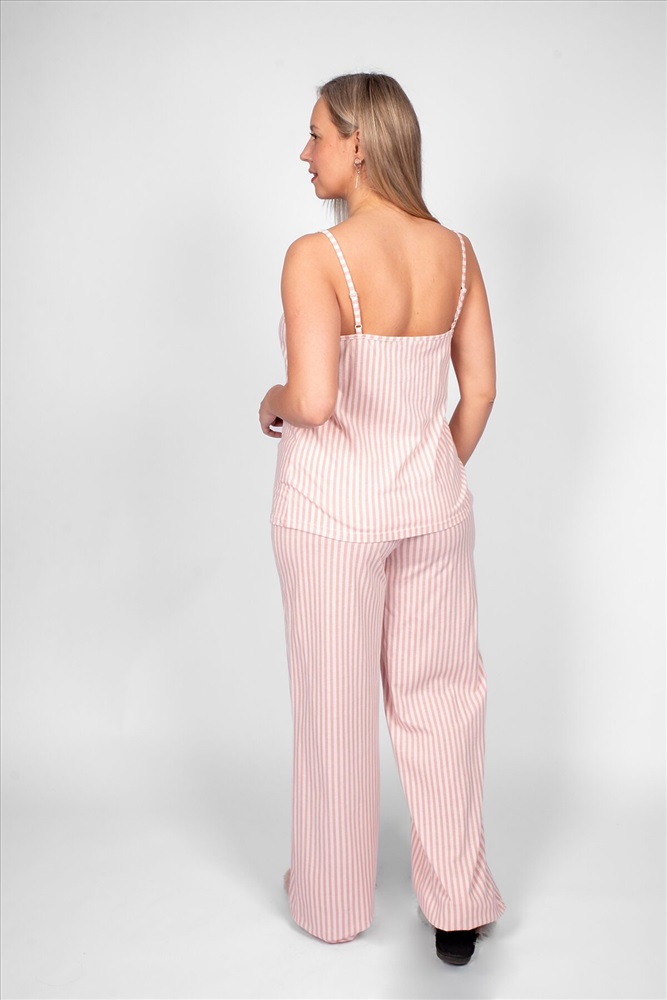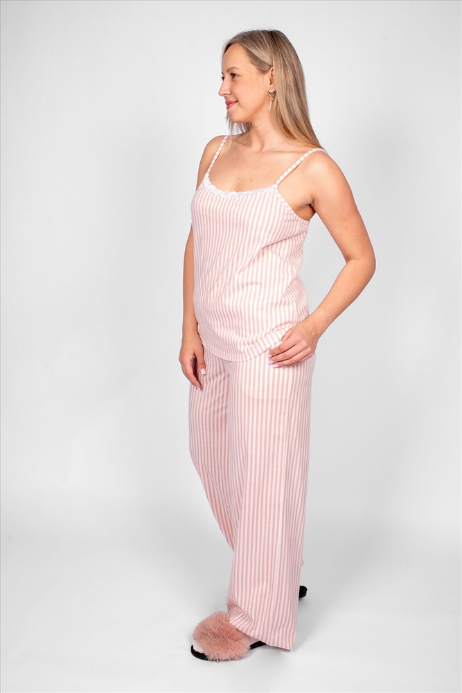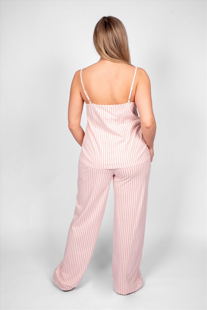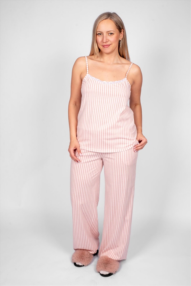 Пижама женская, состоящая из майки на брителях и брюк. Майка женская прямого силуэта с кружевом по линии декольте, из набивного полотна. Бретели регулируемые, 2 колечка и 2 пряжки белого цвета. По линии проймы и горловины притачено кружево белого цвета. Брюки из набивного полотна, силуэт палаццо. Пояс отрезной, выполнен из основного полотна в цвет изделия, с эластичной тесьмой внутри, закрепленной в шов. На передней половинке брюк выполнены карманы с отрезным бочком. Низ изделия обработан швом в подгибку. Модель рассчитана на рост 170-176 см.