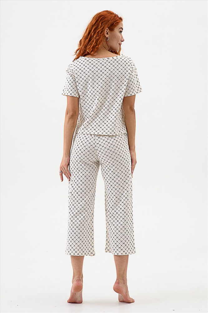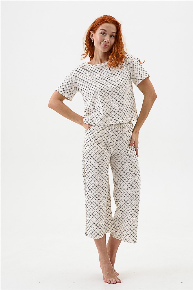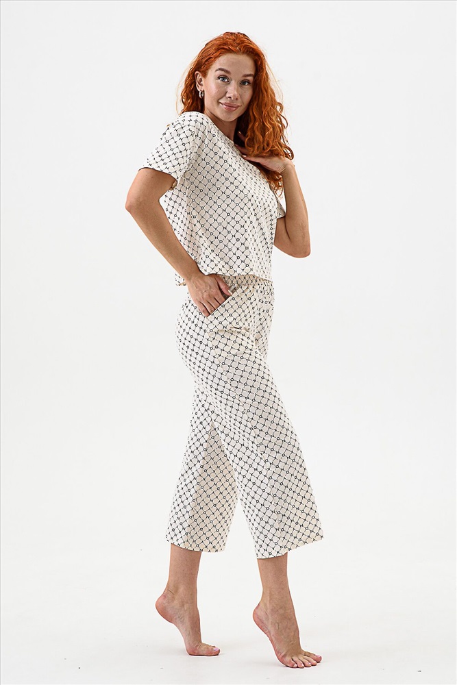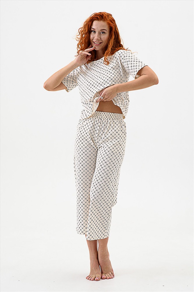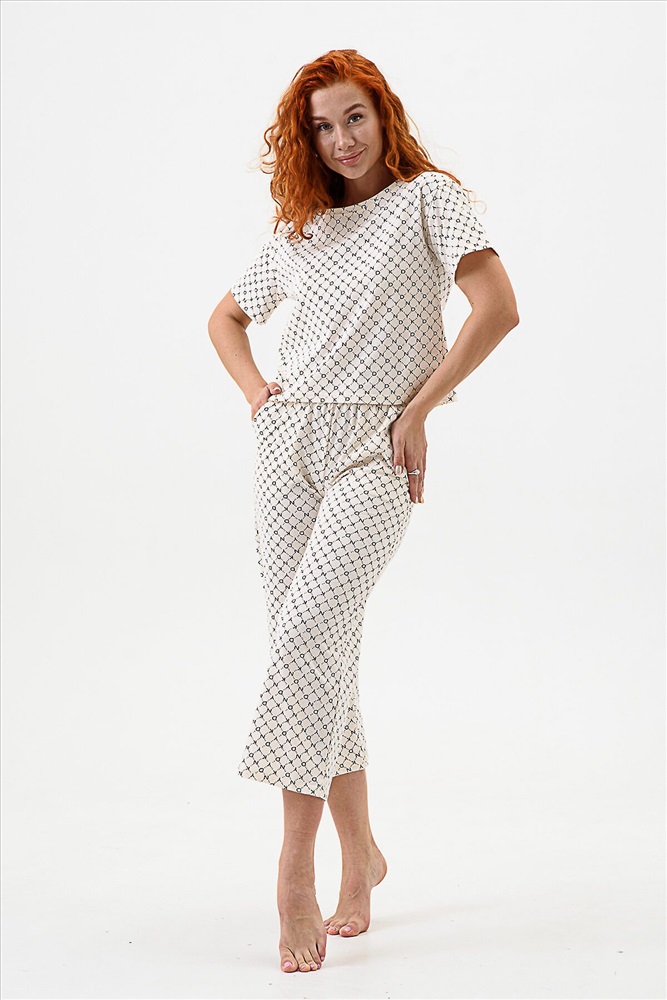 ID товара: 983189 Состав: 100% Хлопок Сезон: Демисезон Длина: Полная Фасон: Свободный Рукав: короткие Декоративные элементы: Принт Основная ткань: Хлопок Вид ткани: Кулирка Страна бренда: Россия Страна производства: Россия Домашний комплект с брюками - кюлотами и футболкой. Брюки с карманами. Длина 7/8. Футболка с коротким рукавом прямого силуэта. Комментарии к товару