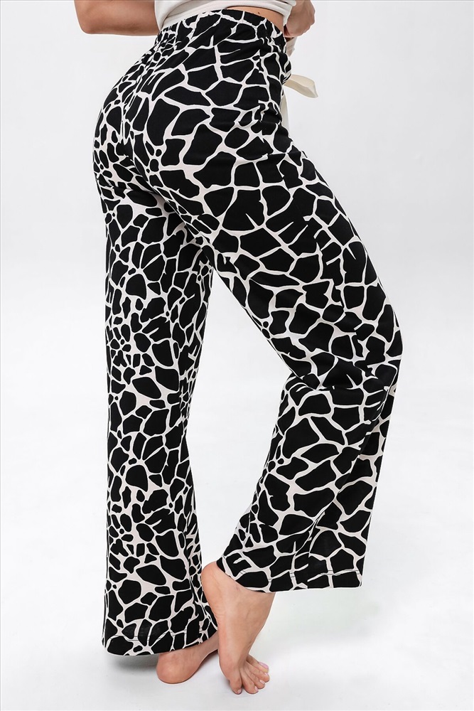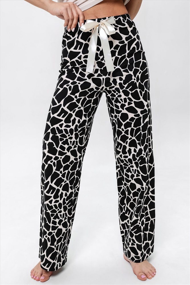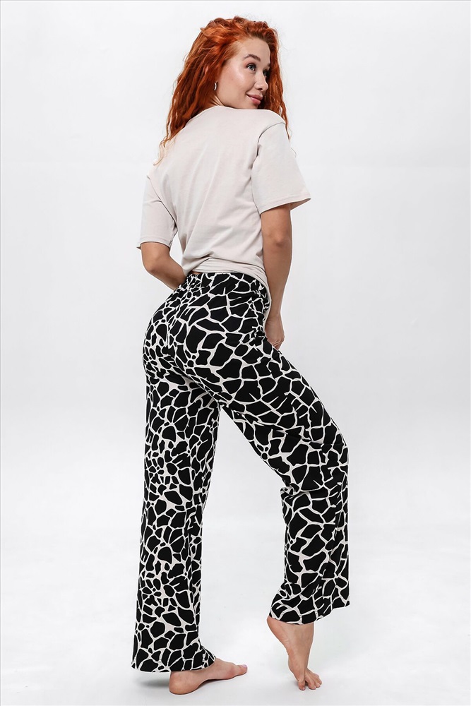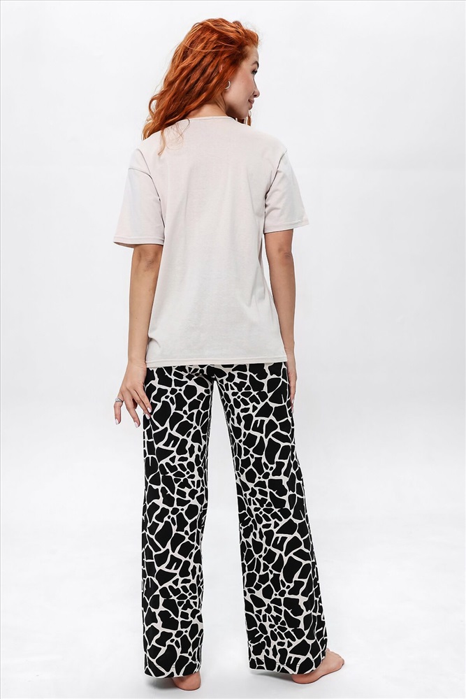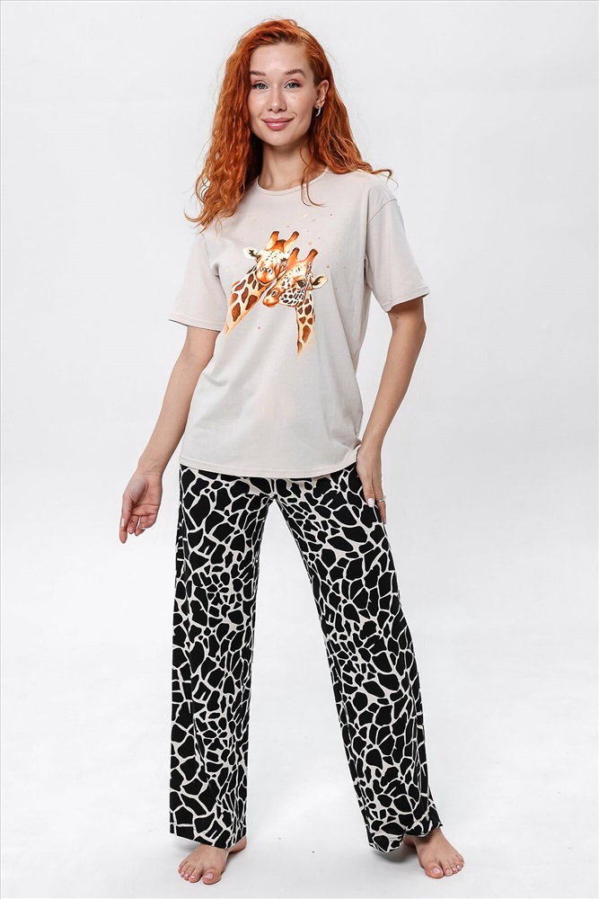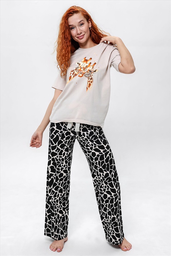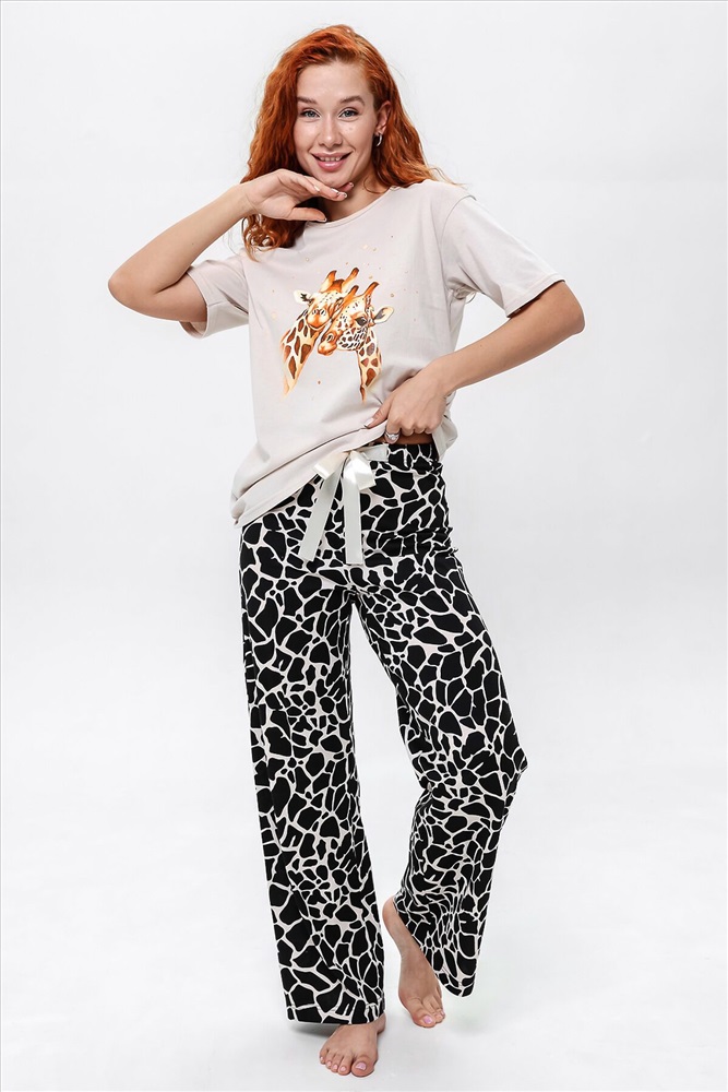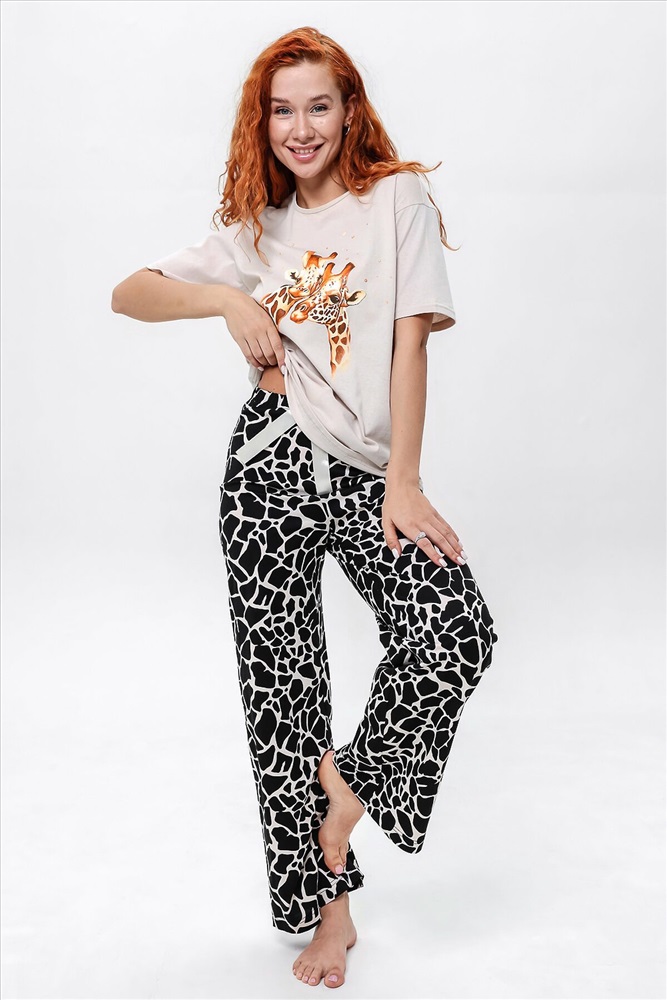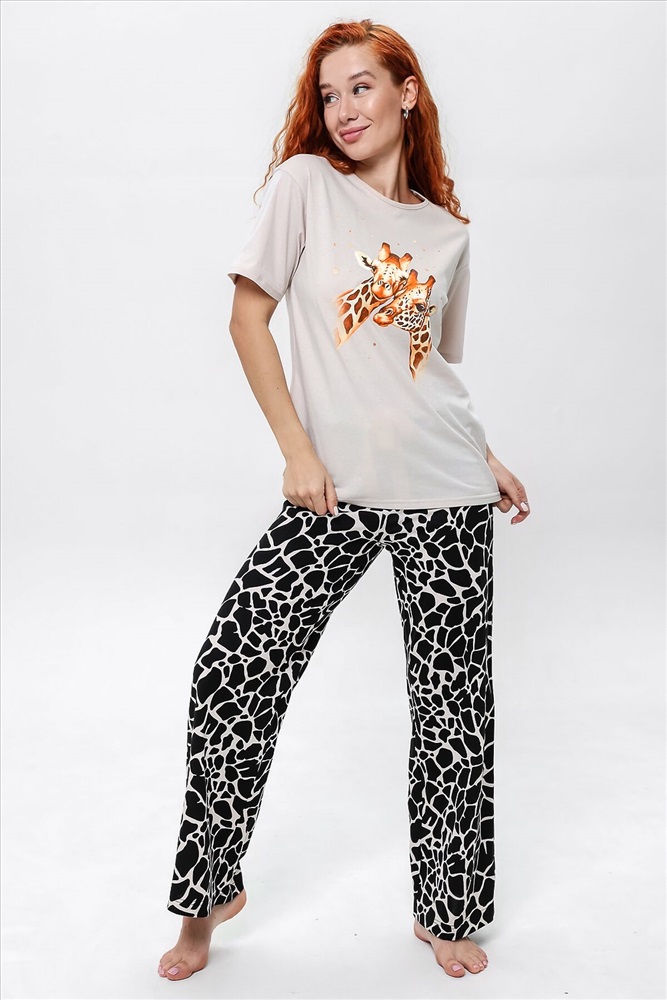 ID товара: 981425 Состав: 100% Хлопок Сезон: Весна/Лето Фасон: Прямой Рукав: Короткий Вид застежки: Шнурок Крой брючин: Прямой Рисунок: Анималистичный Вид ткани: Кулирка Страна бренда: Россия Страна производства: Россия Удобная пижама с милыми жирафами из брюк и футболки. Комплект выполнен из кулирного трикотажного полотна 100% хлопок. Брюки прямые, свободного кроя, на резинке, украшены атласным бантом, выполнены из ткани с рисунком похожим на пятна жирафа. Футболка оверсайз из однотонного полотна украшена принтом с милой парой жирафов. Горловина округлая, обработана окантовкой. Такой домашний костюм поднимет настроение, будет отличным подарком. Комментарии к товару