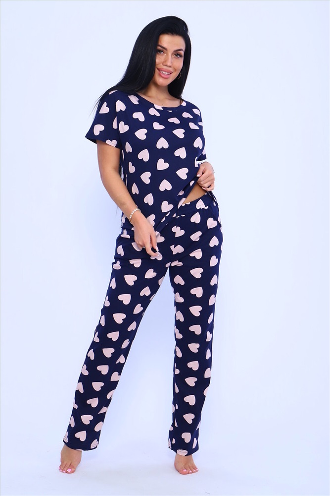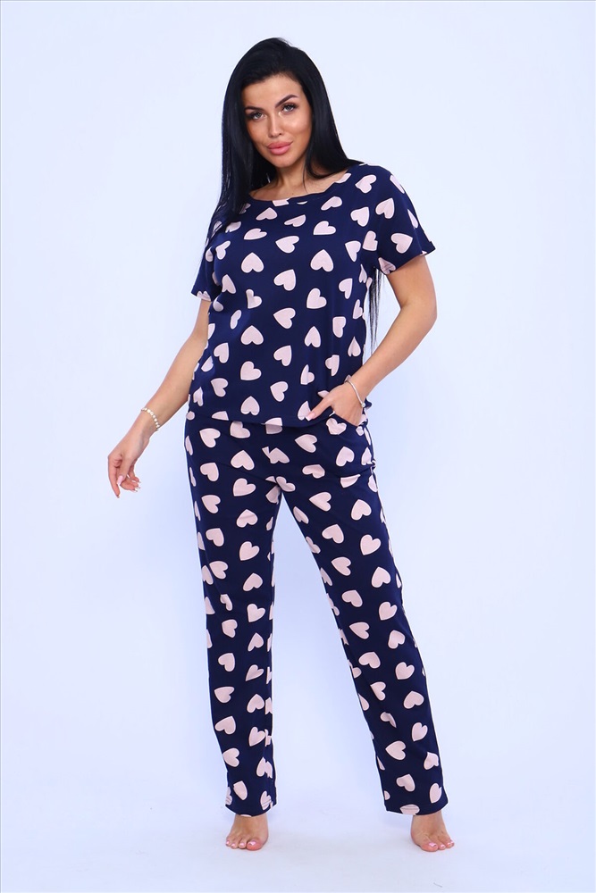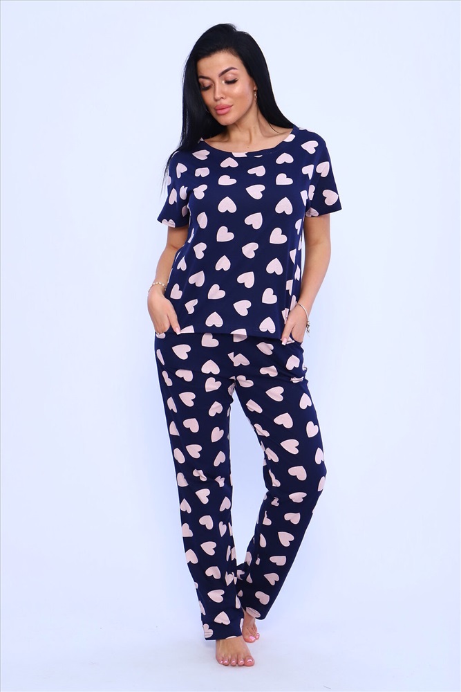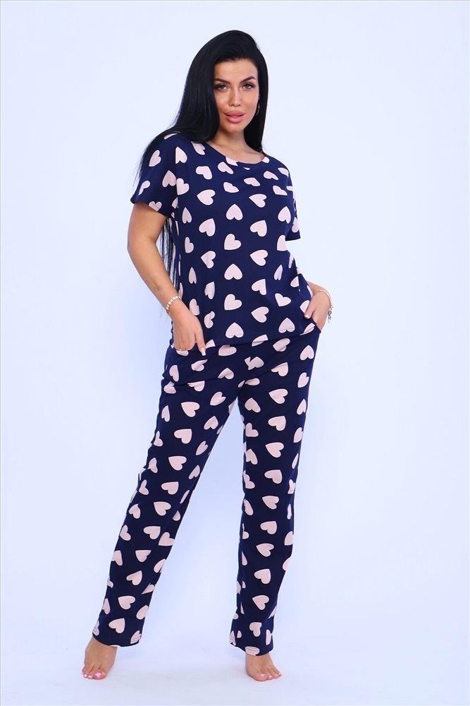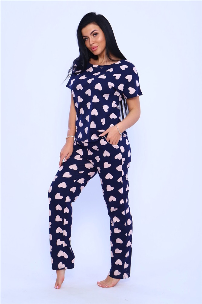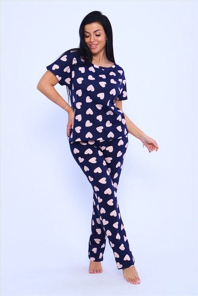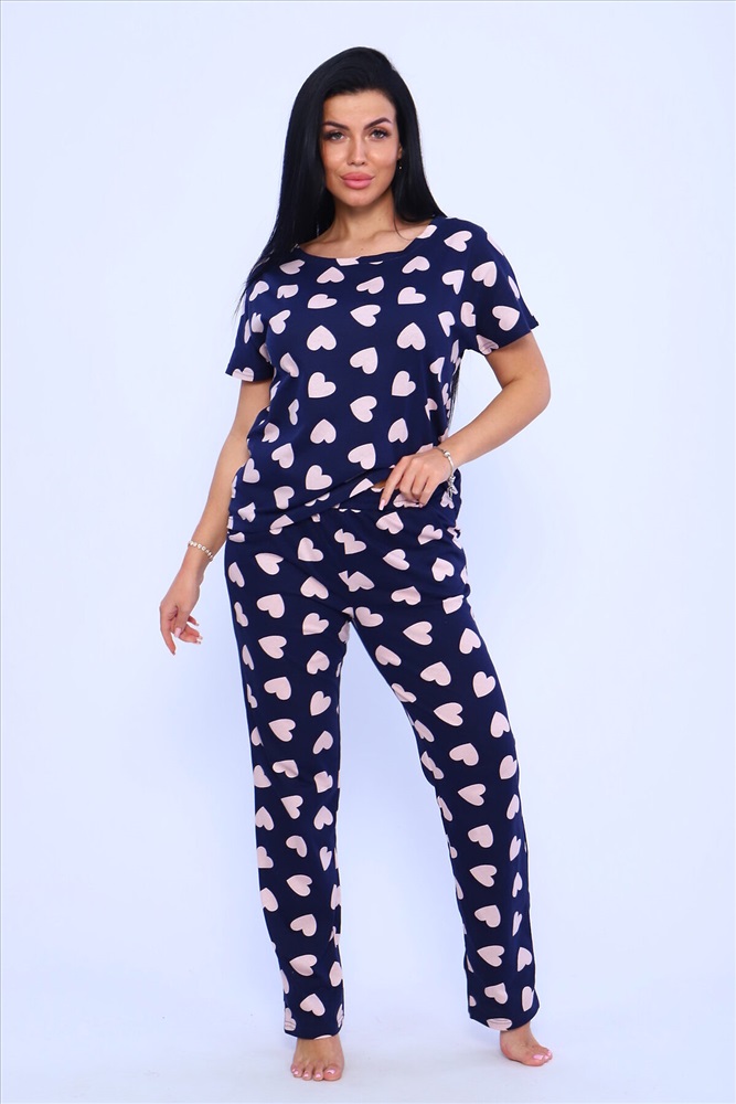ID товара: 948966 Состав: 100% хлопок Сезон: Демисезон Длина: Средняя Фасон: Прямой Рукав: короткие Основная ткань: Хлопок Стиль: Повседневный Вид ткани: Кулирка Страна бренда: Россия Страна производства: Россия Пижама женская с брюками. Пижама - костюм из нежного хлопка с приятным принтом на синем фоне. Футболка цельнокроеная , рукав в подгибку. Брюки длинные с карманами , пояс прострочен. Комментарии к товару