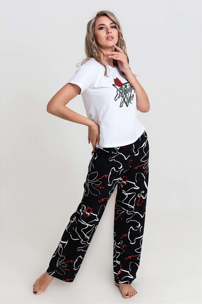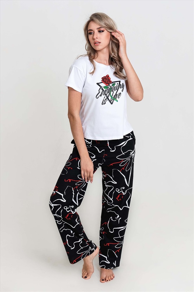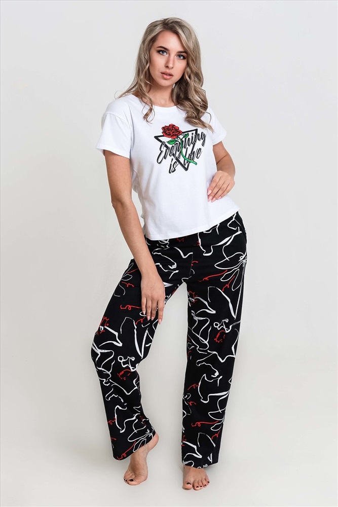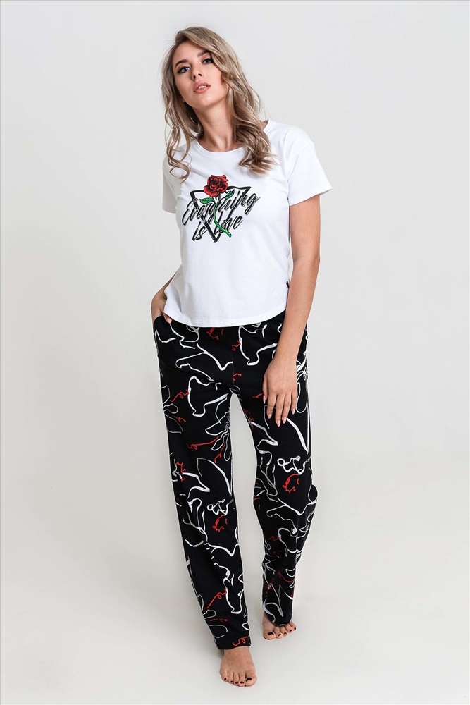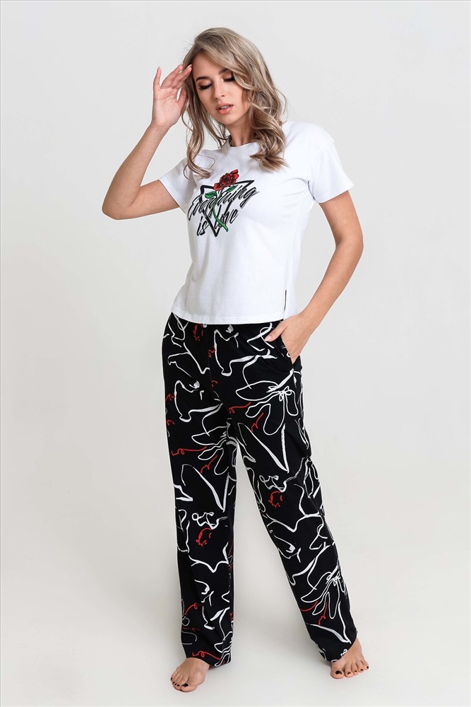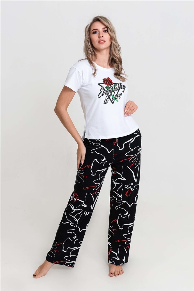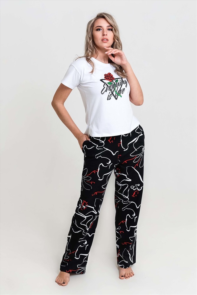 Страна производства: Россия Пижама женская из хлопка от Российского производителя. Футболка 95% хлопок,5% лайкра. Брюки 100% хлопок. Пижама домашняя для сна. Белая футболка укороченная с принтом роза и надписью. Брюки с карманами, пояс на резинке со шнурком. Футболка с брюками подойдут как для повседневного ношения, домашнего времяпрепровождения и комфортного сна. Приятная к телу вещь порадует Вас уютом и комфортом. Отличный подарок сестре, дочери, маме, жене, подруге.