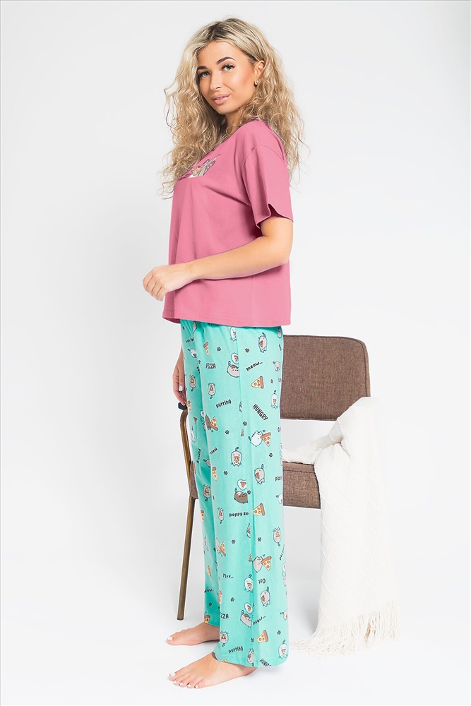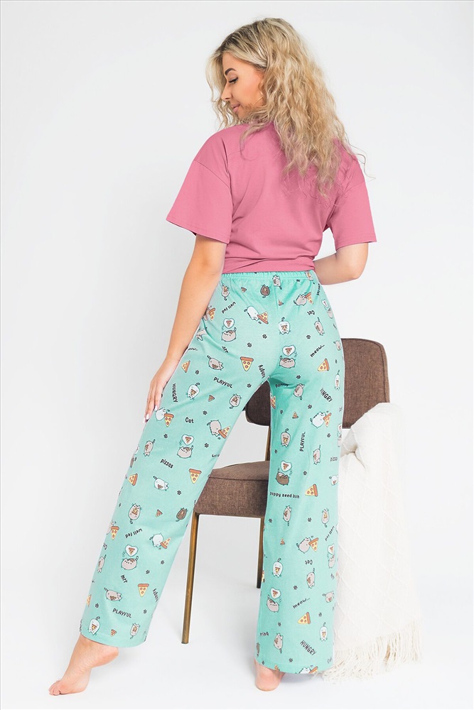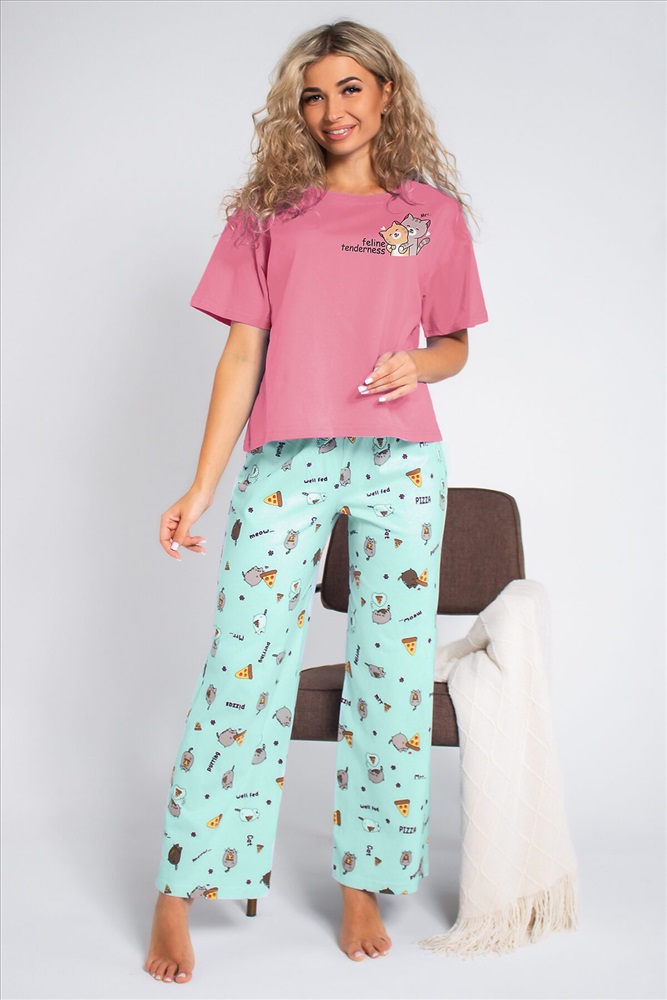 Костюм женский домашний состоит из футболки и брюк. Футболка свободная, длиной до линии бедер, плечо спущенное, рукав втачной короткий. Горловина с обтачкой. На середине переда оригинальный принт. Брюки длинные, свободные прямые без карманов. Пояс на резинке.
