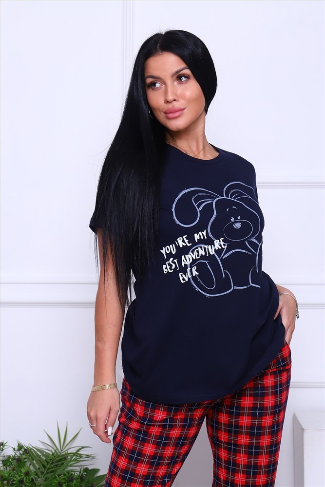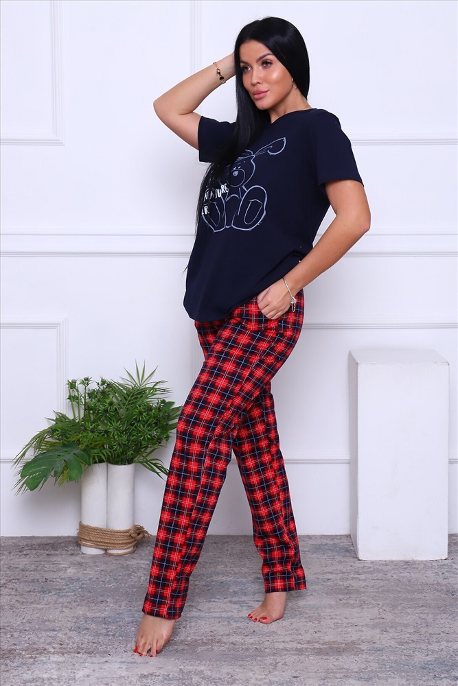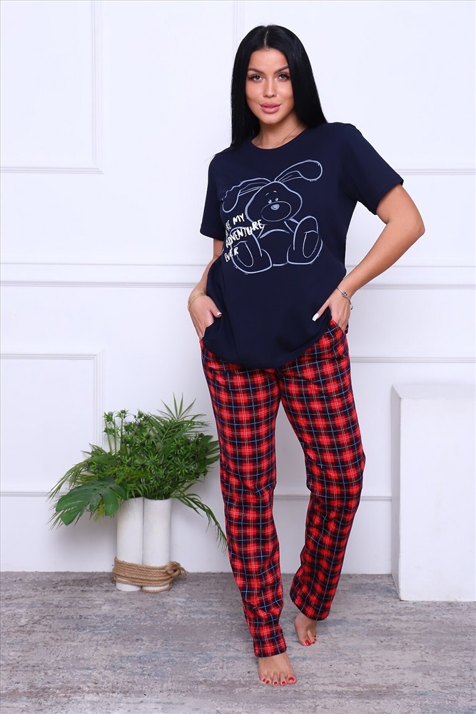 Страна производства: Россия Пижама женская с актуальным новогодним принтом заяц на футболке. Стильные брюки в клетку с удобными карманами и комфортным мягким поясом. Милая уютная домашняя одежда подарит радость Вам и вашим близким!