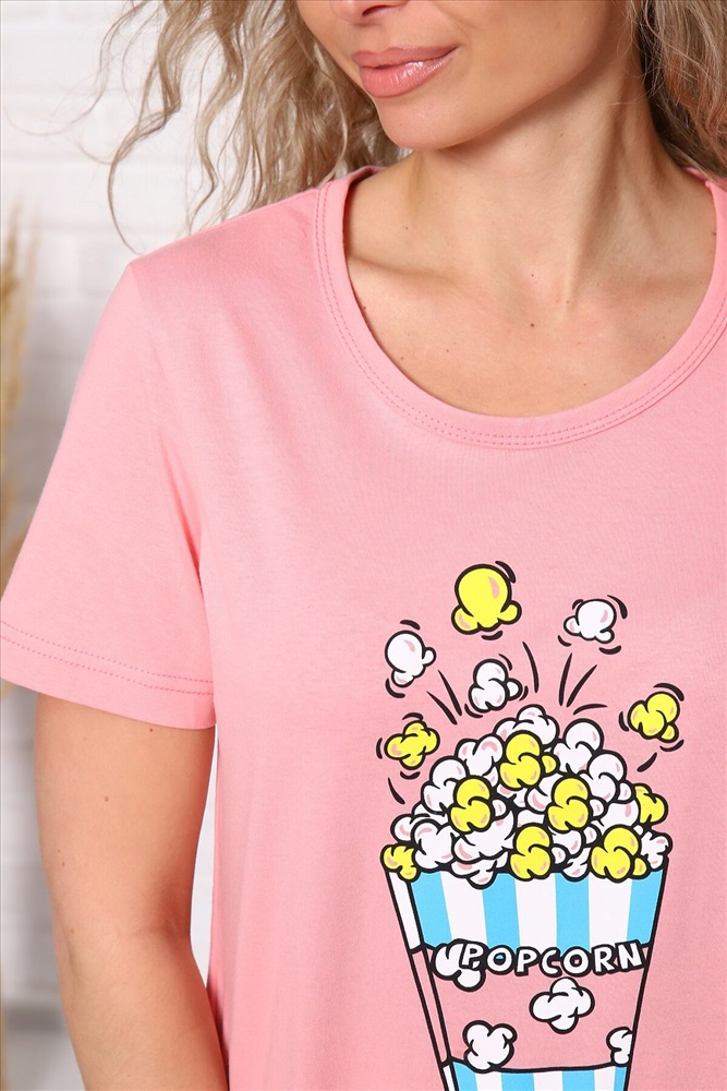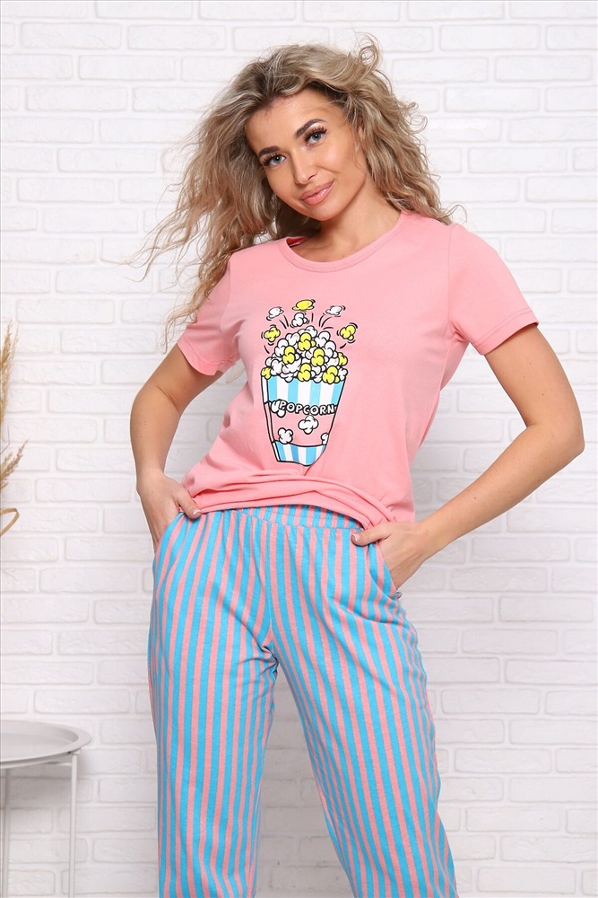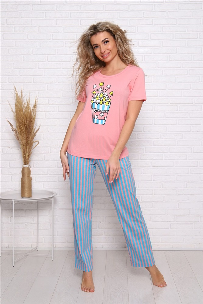 ID товара: 947450 Состав: Хлопок 100% Сезон: Демисезон Длина: Средняя Фасон: Прямой Рукав: короткие Основная ткань: Хлопок Стиль: Повседневный Вид ткани: Кулирка Страна бренда: Россия Страна производства: Россия Пижама женская Попкорн : брюки классические прямые с карманами, футболка с коротким рукавом и с принтом на полочке. Комментарии к товару