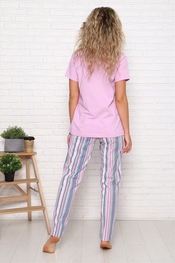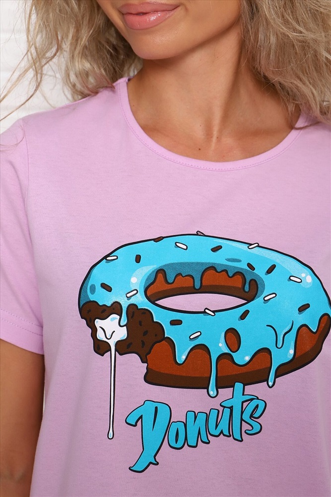 ID товара: 955557 Состав: Хлопок 100% Сезон: Демисезон Длина: Средняя Фасон: Прямой Рукав: короткие Основная ткань: Хлопок Стиль: Повседневный Вид ткани: Кулирка Страна бренда: Россия Страна производства: Россия Пижама женская Донат - футболка классическая с короткими рукавами, с аппетитной печатью и стильные полосатые брюки зауженные с карманами. Комментарии к товару