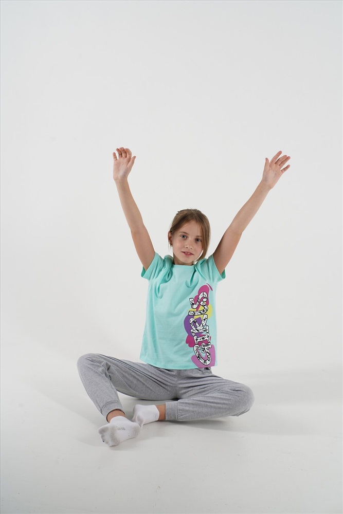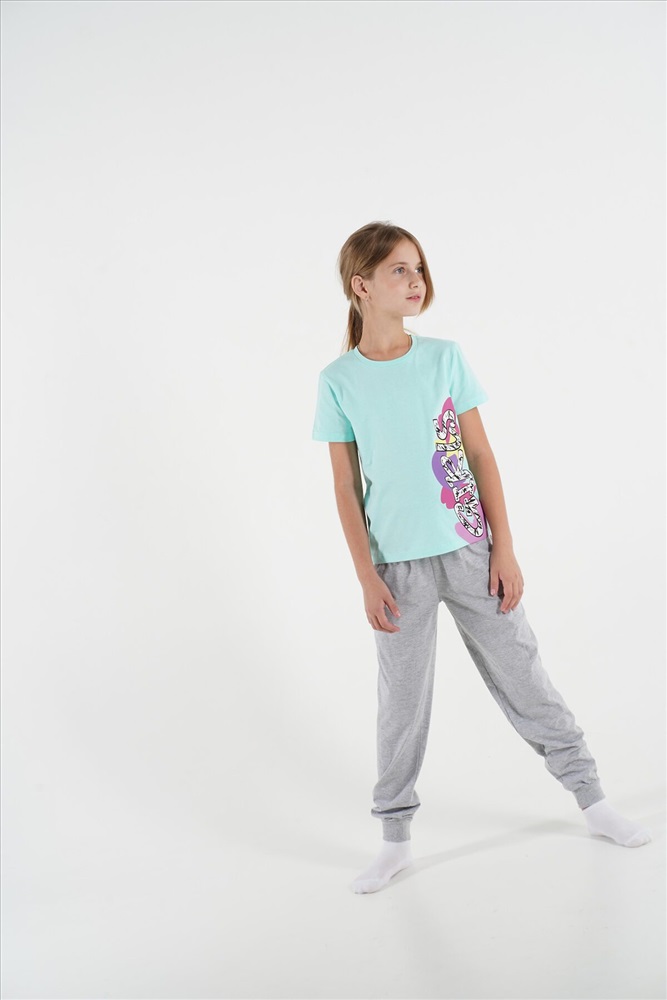 ID товара: 876070 Состав: 100% Хлопок Сезон: Демисезон Длина: Полная Фасон: Свободный крой Рукав: короткие Декоративные элементы: Принт Основная ткань: Кулирка Страна бренда: Россия Страна производства: Россия Пижама для девочки, состоящая из футболки и брюк. Элементы рисунка СВЕТЯТСЯ в темноте. Футболка для девочки прямого силуэта с втачным коротким рукавом. Низ изделия и рукавов обработан швом в подгибку, шириной 2 см, нитками в цвет изделия. Горловина круглая, обработана воротником из кулирки, в цвет изделия. Низ изделия обработан швом вподгибку, шириной 2 см, нитками в цвет изделия. На полочке принт, шелкография с флуоресцентной краской. Брюки прямого покроя. Пояс цельнокроеный, с эластичной тесьмой внутри, шириной 3 см, тесьма закреплена в шов. По низу изделия манжеты из рибаны в цвет изделия. Комментарии к товару