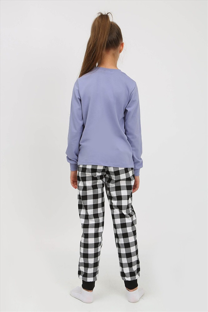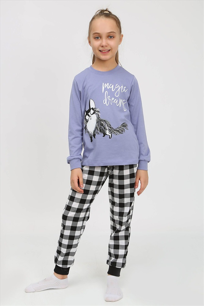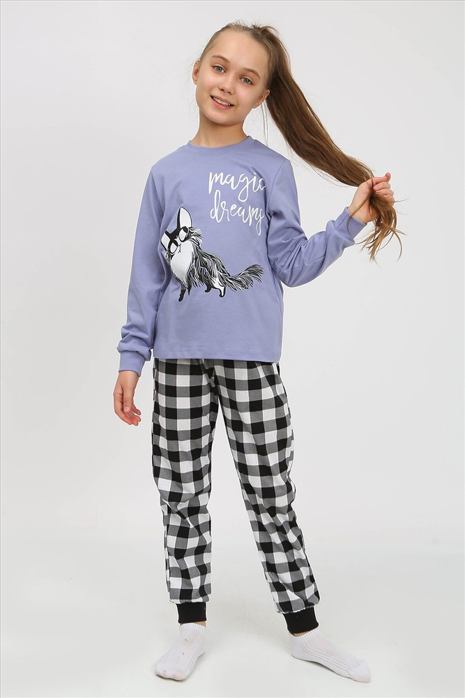 Пижама детская, состоящая из джемпера и брюк. Джемпер прямого силуэта, с втачным длинным рукавом. Горловина круглая обработана воротником из рибаны. На полочке принт шелкография с флуоресцентной краской. Брюки прямого покроя, из набивного полотна. По низу изделия манжеты из рибаны.