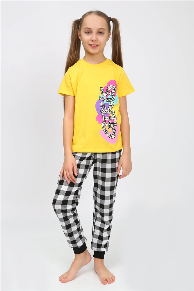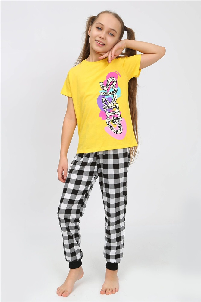 ID товара: 885620 Состав: 100% Хлопок Сезон: Демисезон Длина: Полная Фасон: Прямой Рукав: Длинные Декоративные элементы: Принт Основная ткань: Хлопок | Кулирка Страна бренда: Россия Страна производства: Россия Пижама детская, состоящая из джемпера и брюк. Джемпер прямого силуэта, с втачным длинным рукавом. Горловина круглая обработана воротником из рибаны. На полочке принт шелкография. Брюки прямого покроя, из набивного полотна. По низу изделия манжеты из рибаны. Комментарии к товару