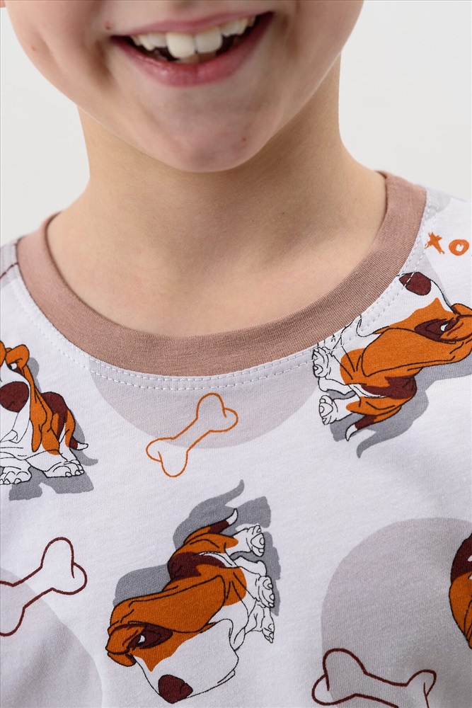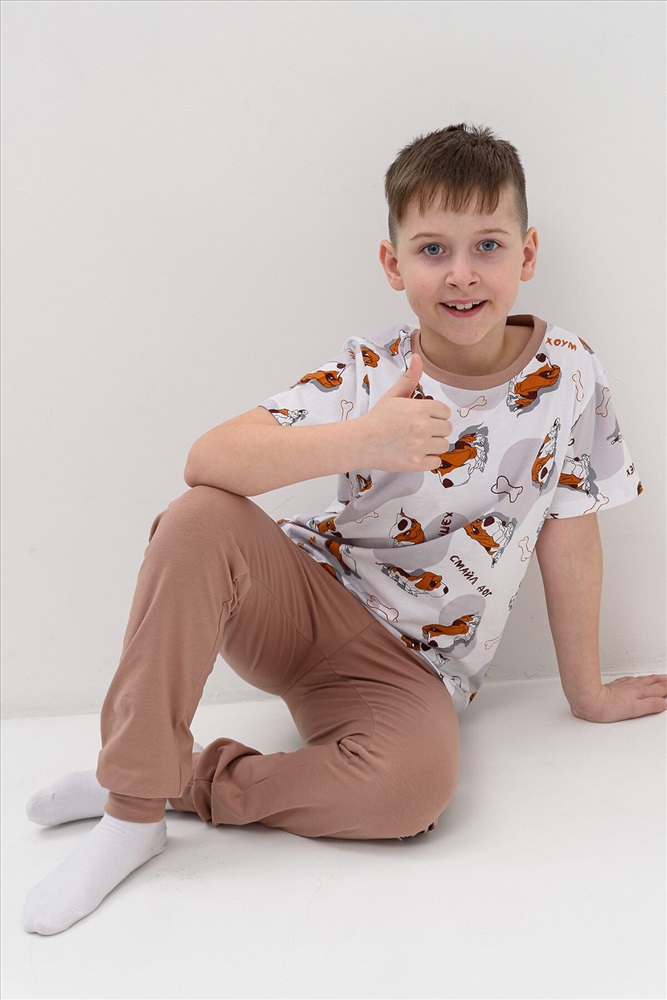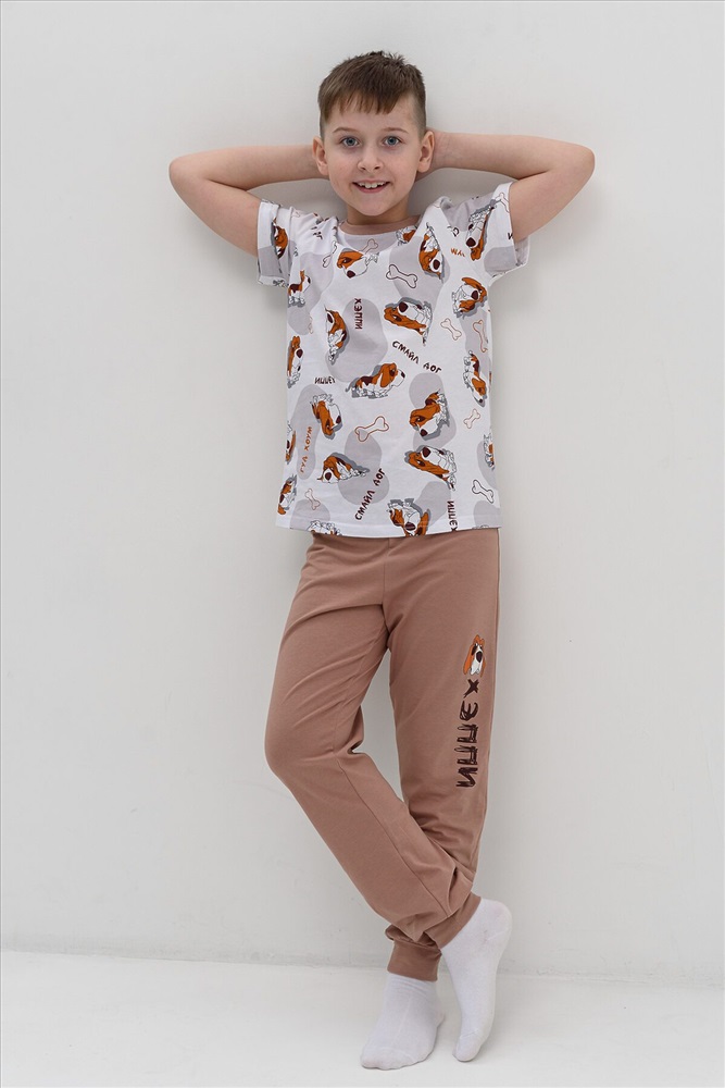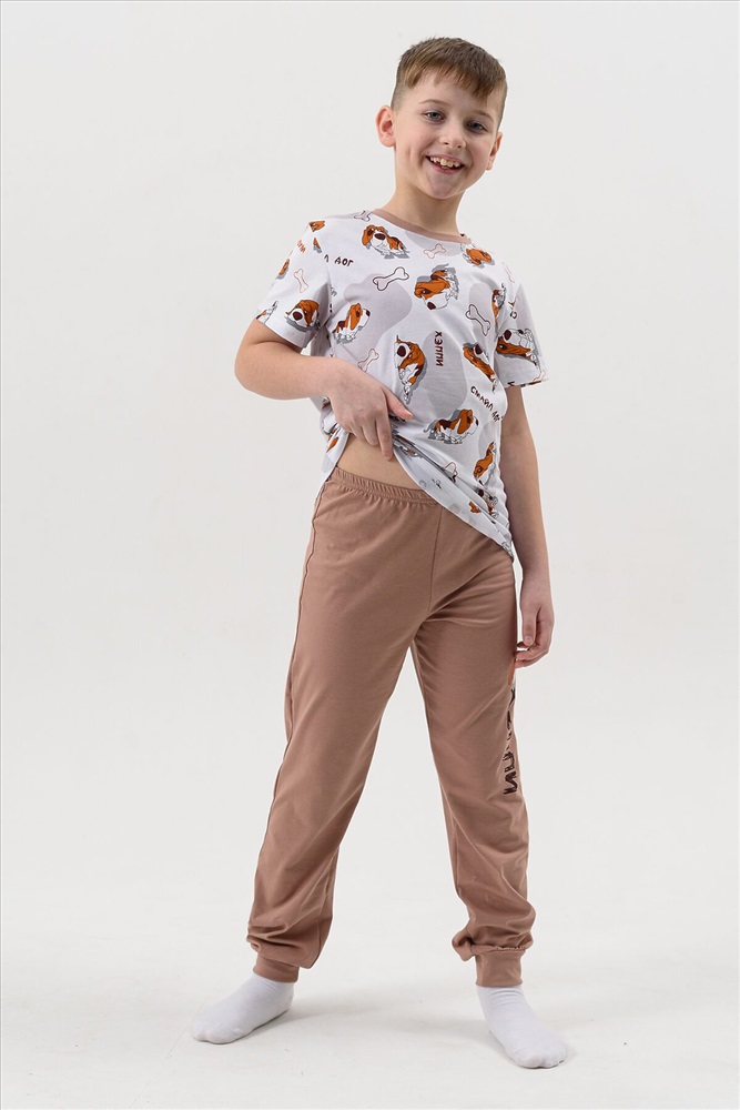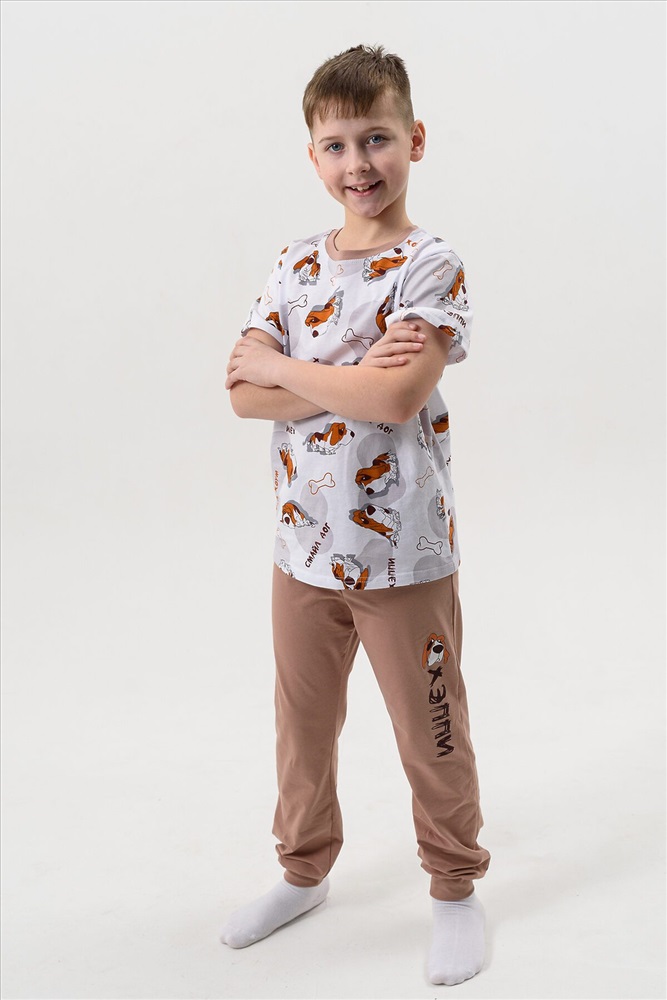 Пижама для мальчика детская, состоящая из футболки - набивное полотно и брюк с манжетой. Пижамка согревает, даже если ребенок ворочается и раскрывается во сне, а также создает ощущение уюта, ребенок спит глубже и реже просыпается. Также стильная пижама печатью собачка для подростков создает хорошее настроение. Можно носить как домашний костюм или использовать как летнюю пижаму, для дома или в садике. Пижамный костюм без карманов для полного комфорта во сне и застежек, свободного полуприлегающего силуэта, для комфортного сна ребенка. Пижамка с удобной посадкой и нетугой резинкой. Яркий и модный молодежный пижамный стиль для детей и подростков, пижама для мальчика подростка.