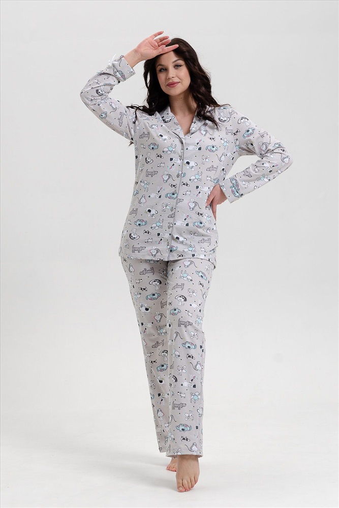 Красивая, мягкая и уютная хлопковая пижама согреет вас холодными зимними вечерами! Пижама-костюм, состоящая из прямых брюк свободной формы и легкого жакета-рубашки на центральную застежку на пуговицы с длинным рукавом. Воротник английский отложной с контрастным кантом по краю. Брюки на поясе с резинкой и блестящей тесьмой, низ с отрезной манжетой с кантом. Пижама не стесняет движений, в ней приятно спать и заниматься домашними делами. Комплект можно купить в подарок символ нового года родным и близким!