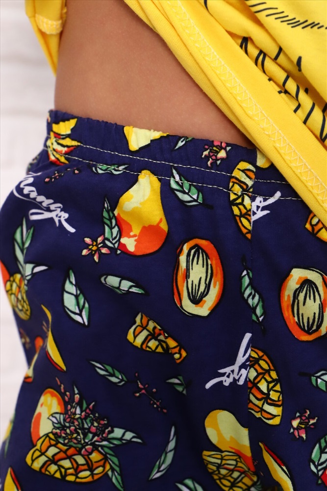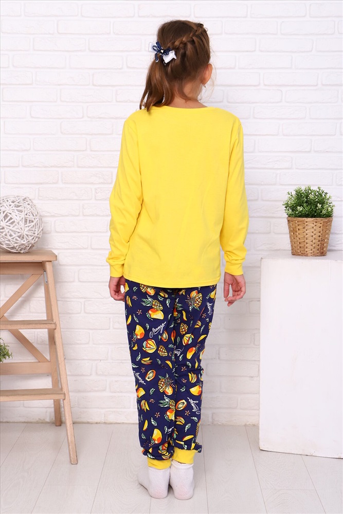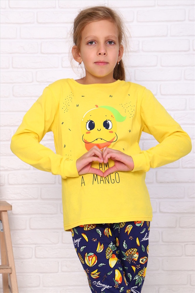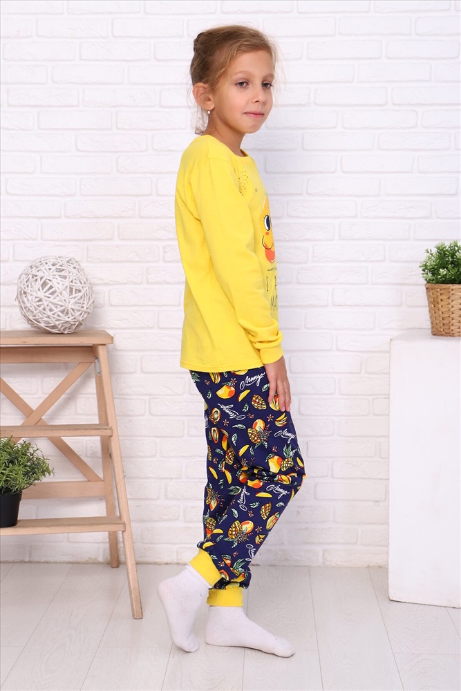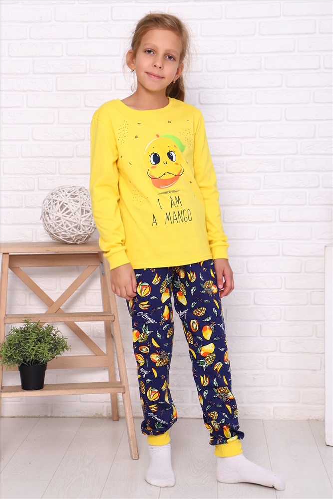 Пижама для девочек дошкольного, младшего и старшего школьного возраста, из набивного и однотонного трикотажных полотен кулирная гладь и эластичного трикотажного полотна - рибана. Пижама состоит из свободных брюк и лонгслива. Лонгслив выполнен из однотонного полотна, брюки из набивного.Манжеты рукавов и брюк и обтачка горловины выполнены из рибаны. Лонгслив прямого силуэта, с втачным рукавом. Спереди и на спинке отсутствуют линии членения. Рукав длинный, одношовный, на манжете. Горловина с обтачкой. По шву втачивания обтачки в горловину проложена отделочная строчка. Низ лонгслива подогнут. Брюки прямые, на манжетах. Верхний срез брюк подогнут с резинкой 2см. На переднюю часть лонгслива нанесен печатный рисунок.