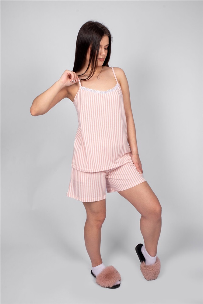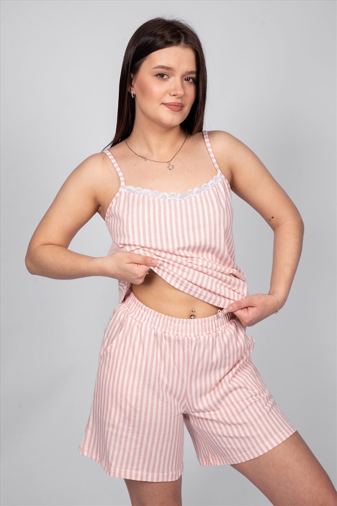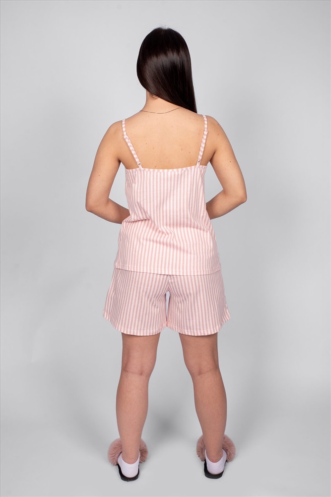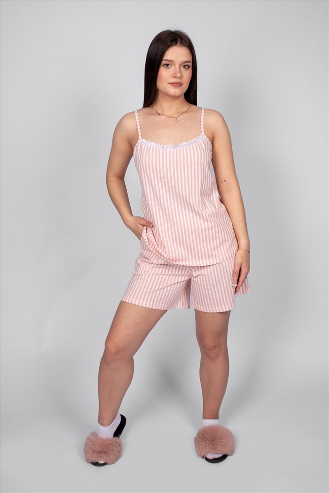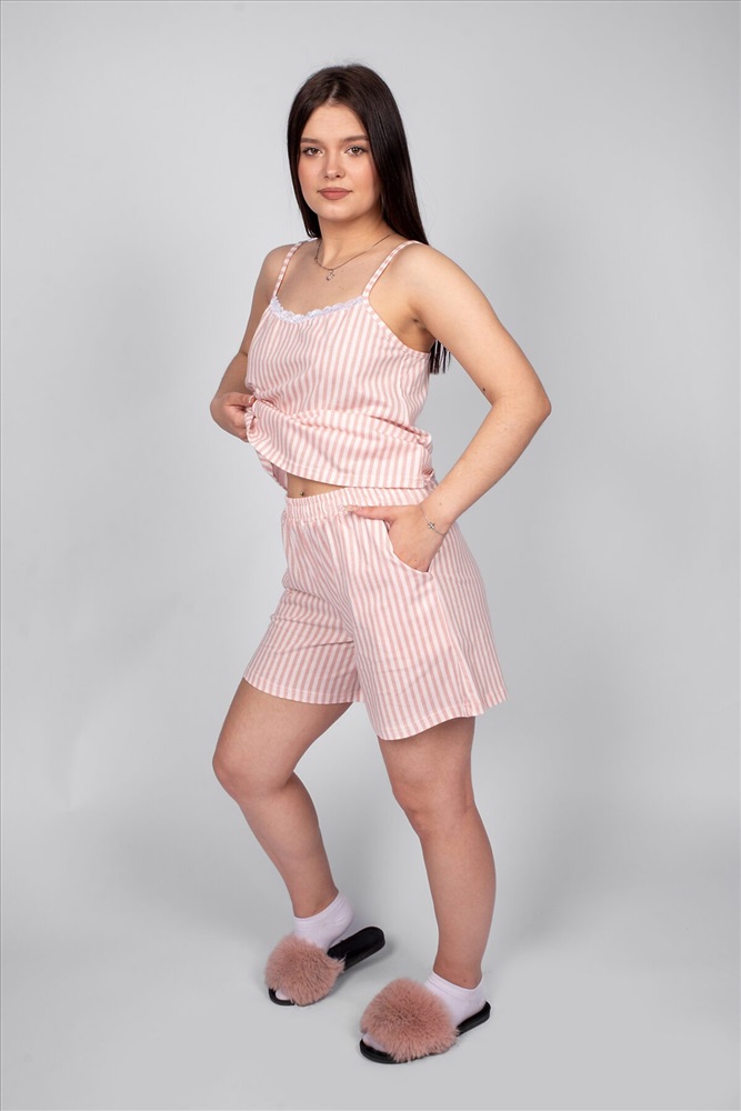 ID товара: 1018615 Состав: 100% Хлопок Сезон: Весна/Лето Фасон: Прямой Рукав: Без рукава Крой брючин: Прямой Рисунок: Полоска Вид ткани: Кулирка Страна бренда: Россия Страна производства: Россия Пижама женская, состоящая из майки на бретелях и шорт. Майка женская прямого силуэта, с кружевом по линии декольте. Бретели регулируемые, 2 колечка и 2 пряжки белого цвета. На полочке по линии проймы и горловины притачено кружево белого цвета. Низ майки обработан швом в подгибку. Шорты женские из набивного полотна. Пояс отрезной, выполнен из основного полотна в цвет изделия, с эластичной тесьмой внутри, закрепленной в шов. На передних половинах шорт карманы с отрезным бочком. Низ шорт обработан швом в подгибку. Модель рассчитана на рост 164-170 см. Комментарии к товару
