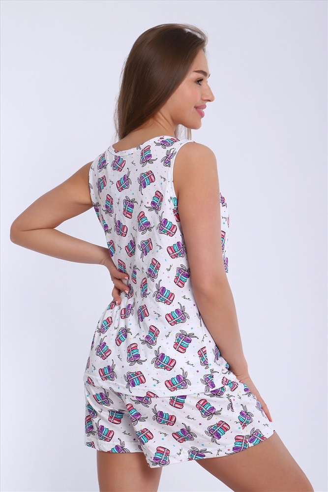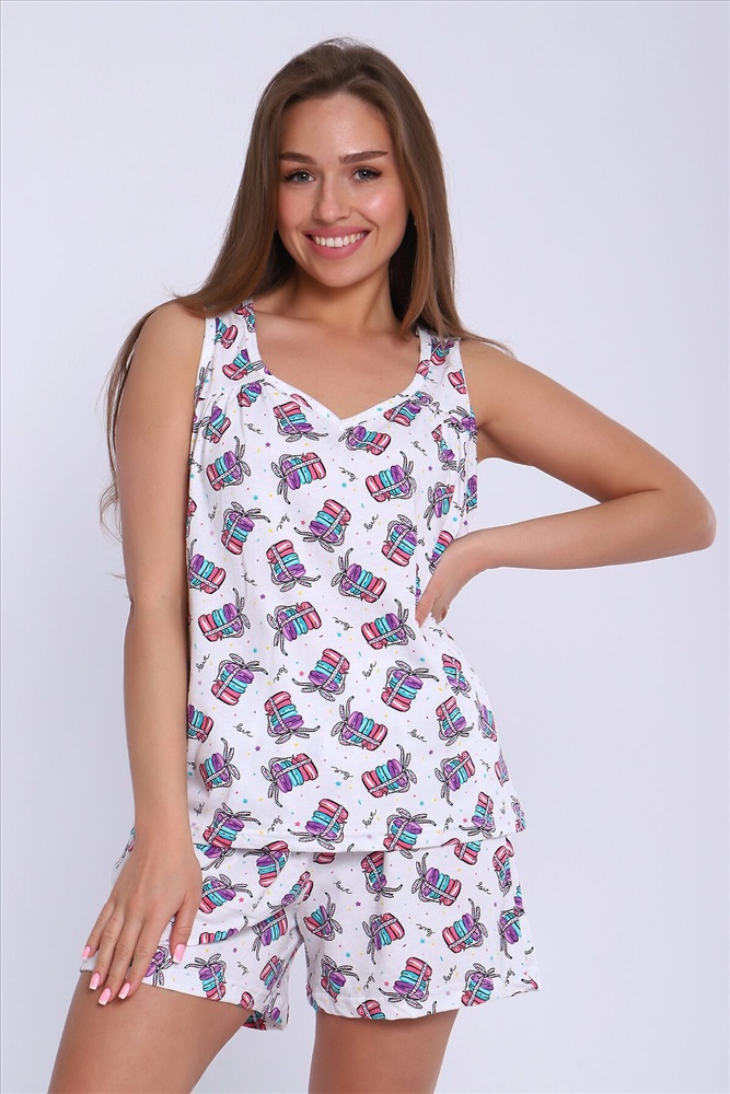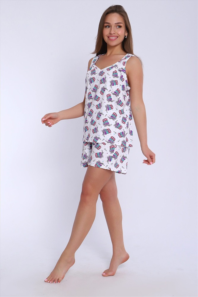 ID товара: 1017125 Состав: 100% Хлопок Сезон: Демисезон Длина: Средняя Фасон: Полуприлегающий Рукав: без рукавов Декоративные элементы: Принт Основная ткань: Хлопок Вид ткани: Кулирка Страна бренда: Россия Страна производства: Россия Пижама состоит из майки и шорт. Майка с V - образным вырезом горловины и сборкой над грудью. Комфортна для повседневной носки и сна. Комментарии к товару