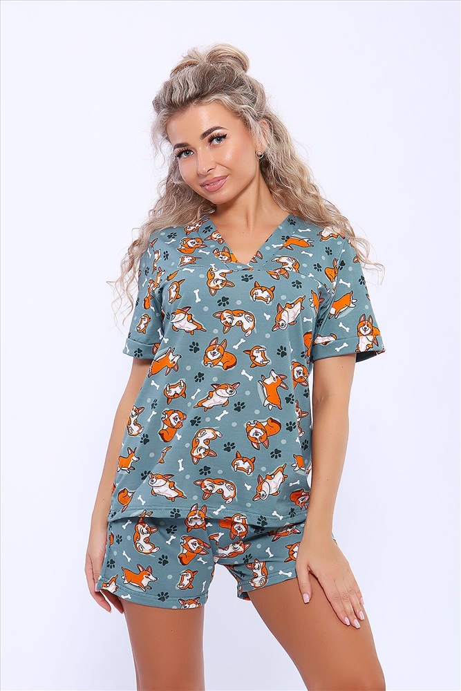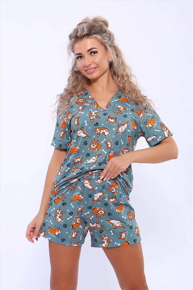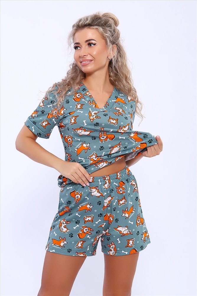 Страна производства: Россия Пижама состоит из футболки и шорт. Футболка с короткими рукавами на манжетах и V - образным вырезом горловины.