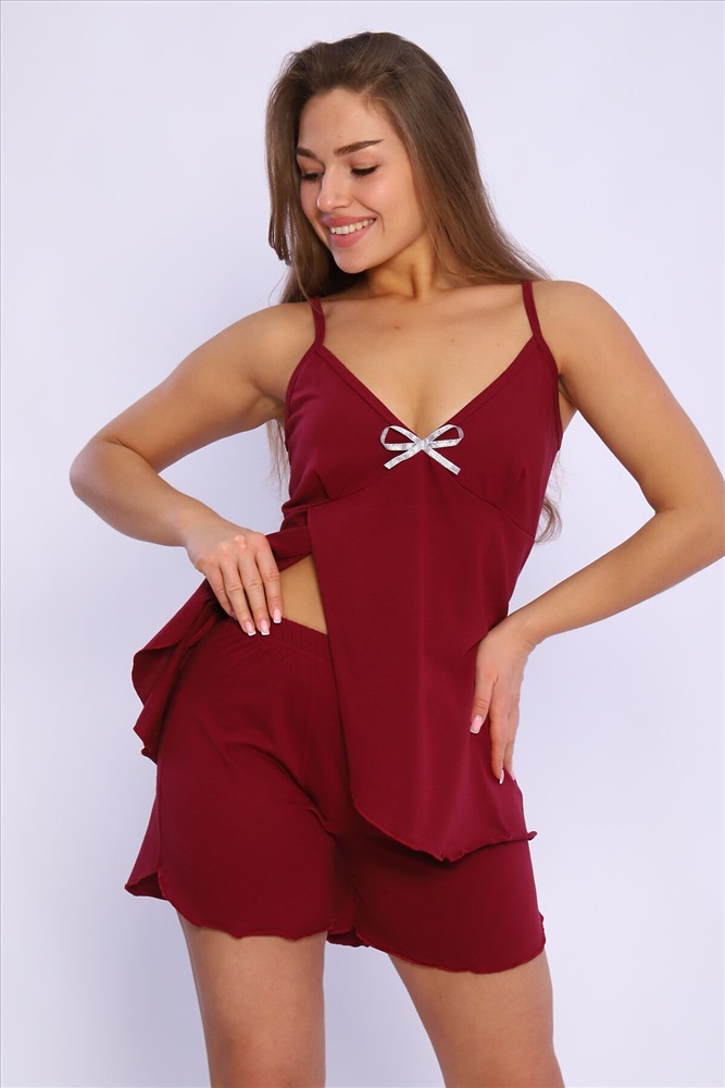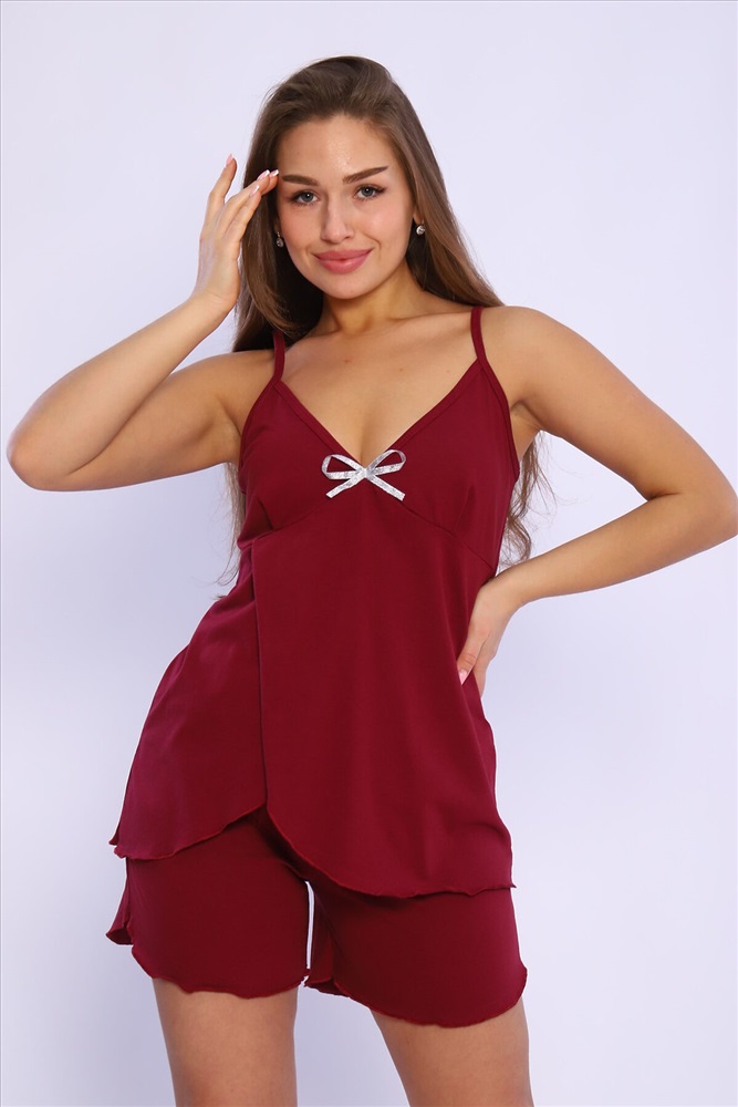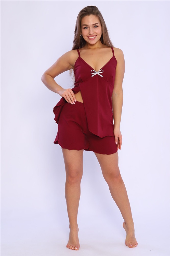 ID товара: 980408 Состав: 100% Хлопок Сезон: Весна/Лето Длина: Короткая Фасон: Свободный крой Рукав: Без рукава Вид ткани: Кулирка Страна бренда: Россия Страна производства: Россия Пижама состоит из майки и шорт. Майка на бретелях, лиф с вытачками. Нижняя часть ассиметрична на запах. Шорты на притачной резинке, расширены к низу. Комментарии к товару